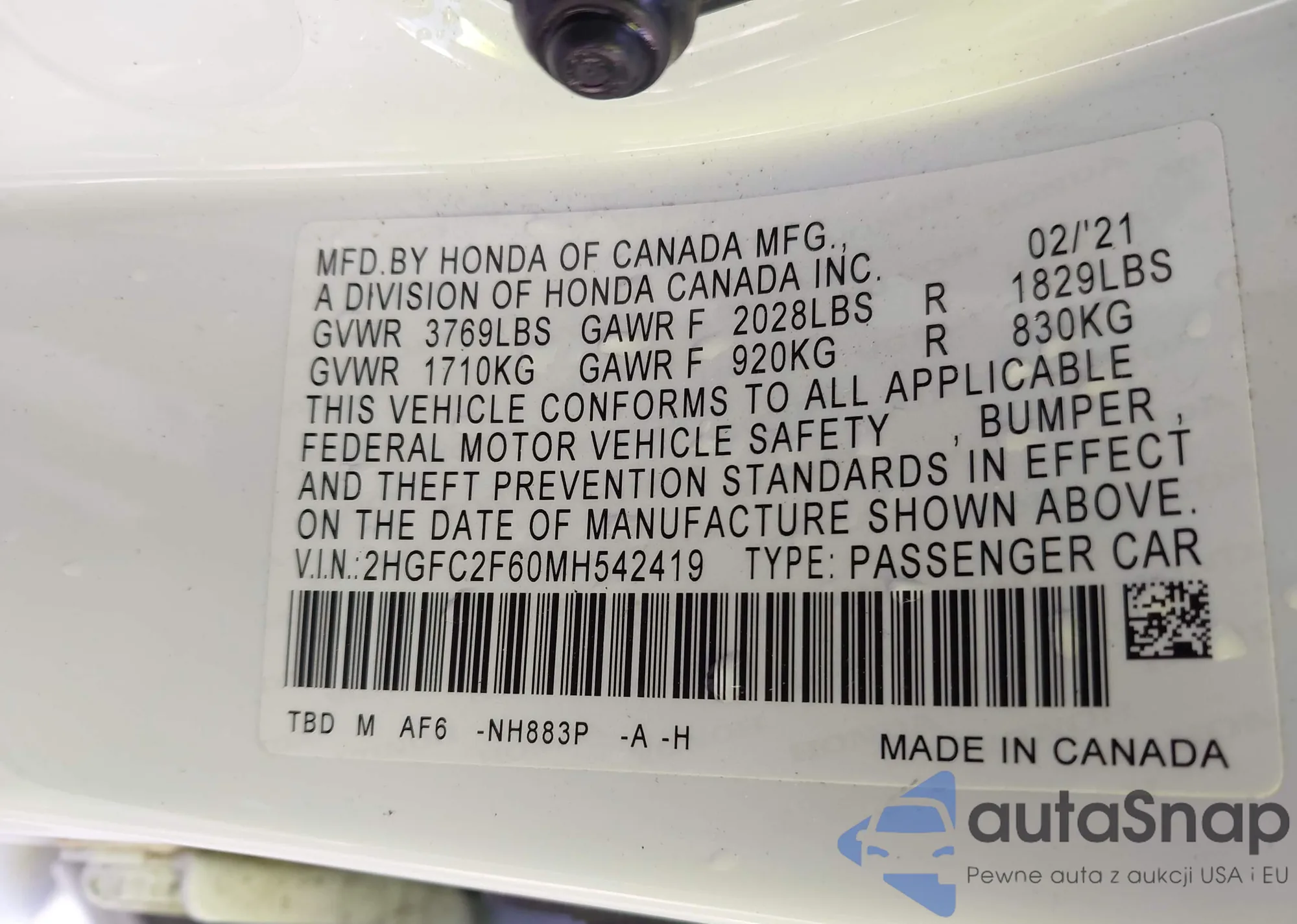 VIN: 2HGFC2F60MH542419