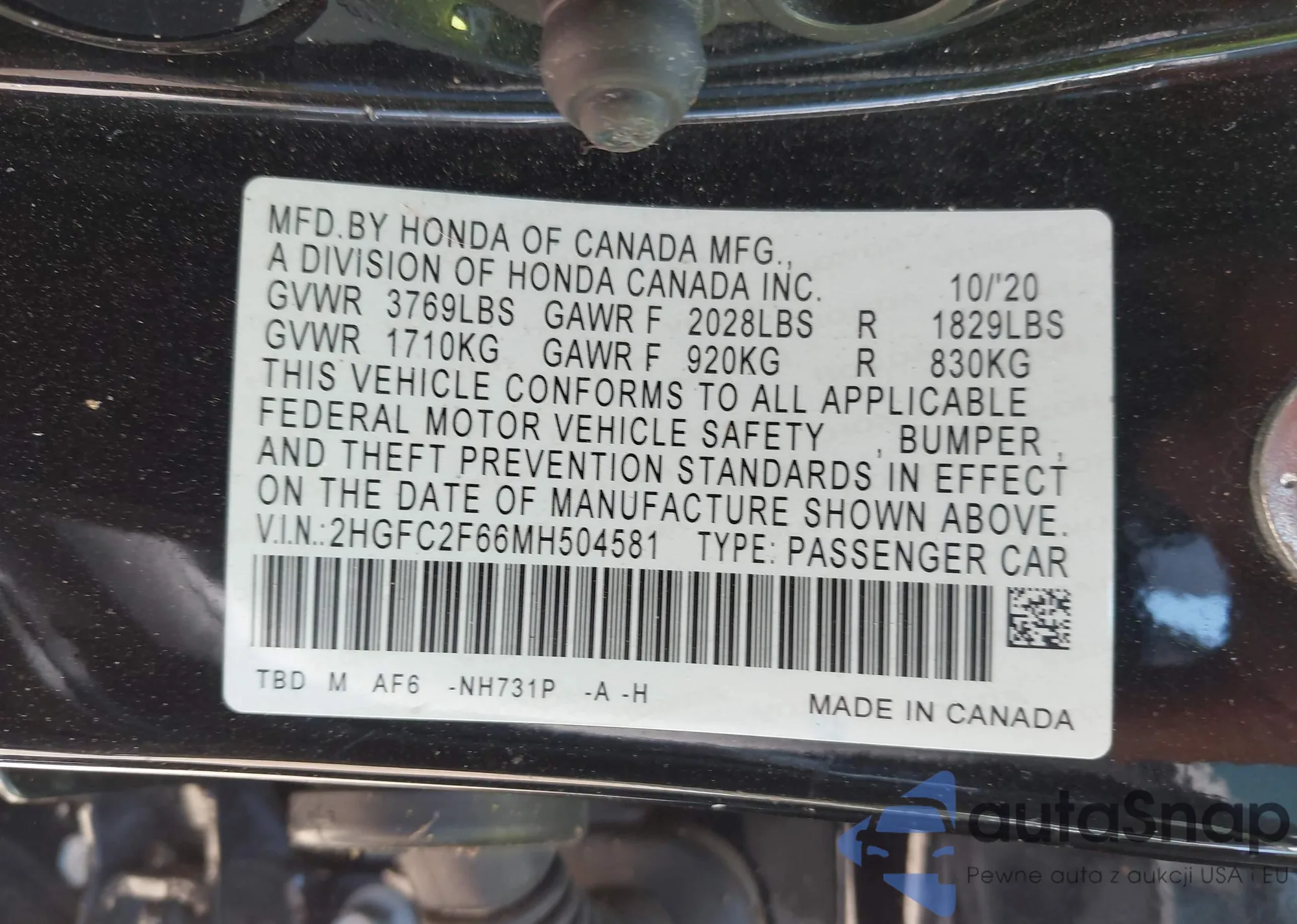 VIN: 2HGFC2F66MH504581