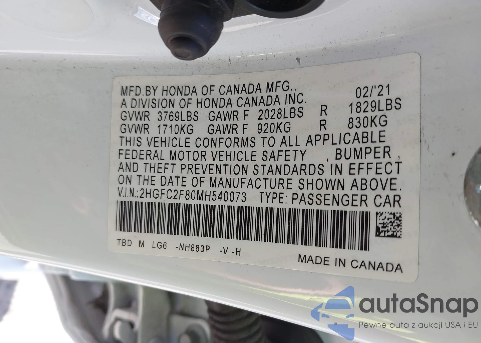 VIN: 2HGFC2F80MH540073
