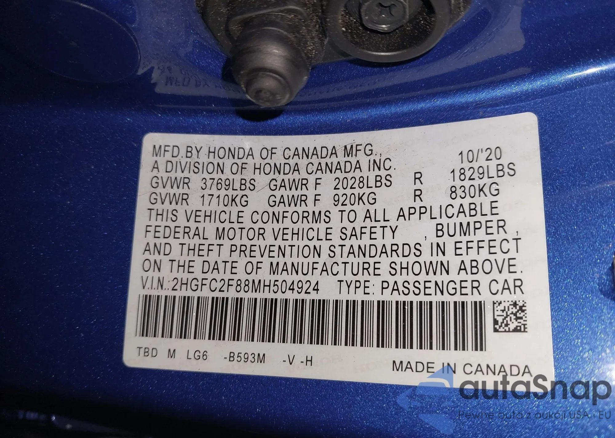 VIN: 2HGFC2F88MH504924