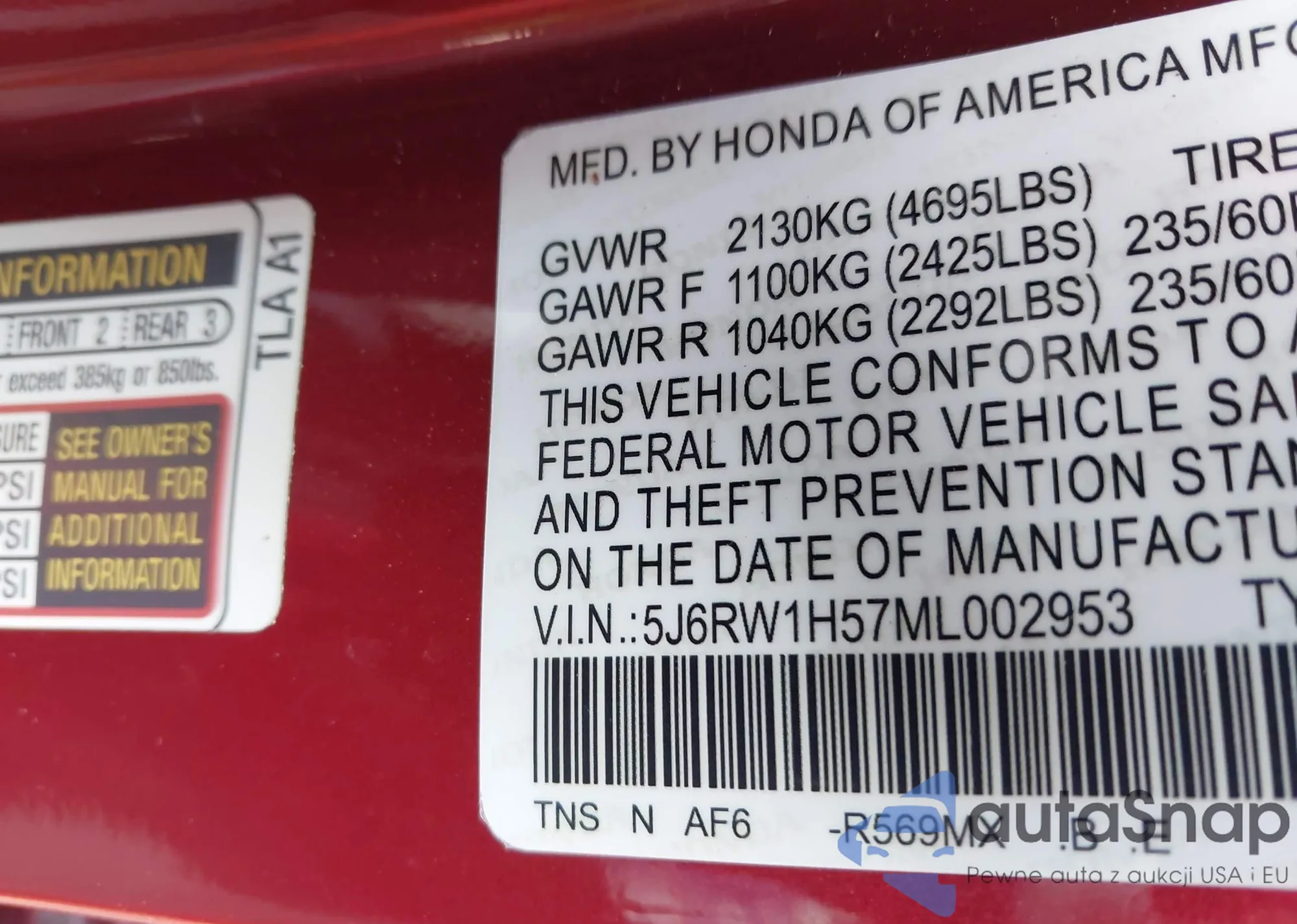 Samochód Honda CR-V 2021 (VIN 5J6RW1H57ML002953) nie był wcześniej licytowany. Dokumenty są czyste, przebieg odpowiada lub jest niższy niż średnia rynku. Sprzedaje go firma ubezpieczeniowa – polecamy zakup. Dostawa do portu zajmie ok. 6–8 tygodni.