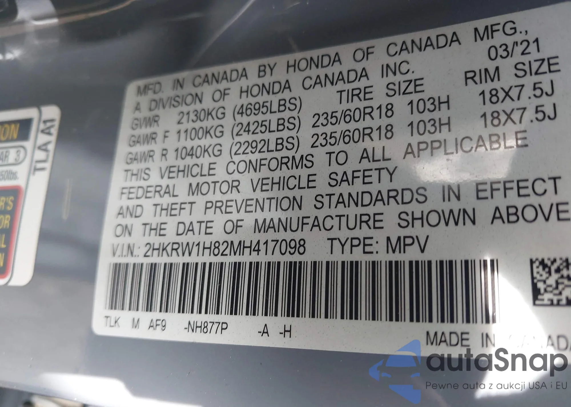 • VIN: 2HKRW1H82MH417098