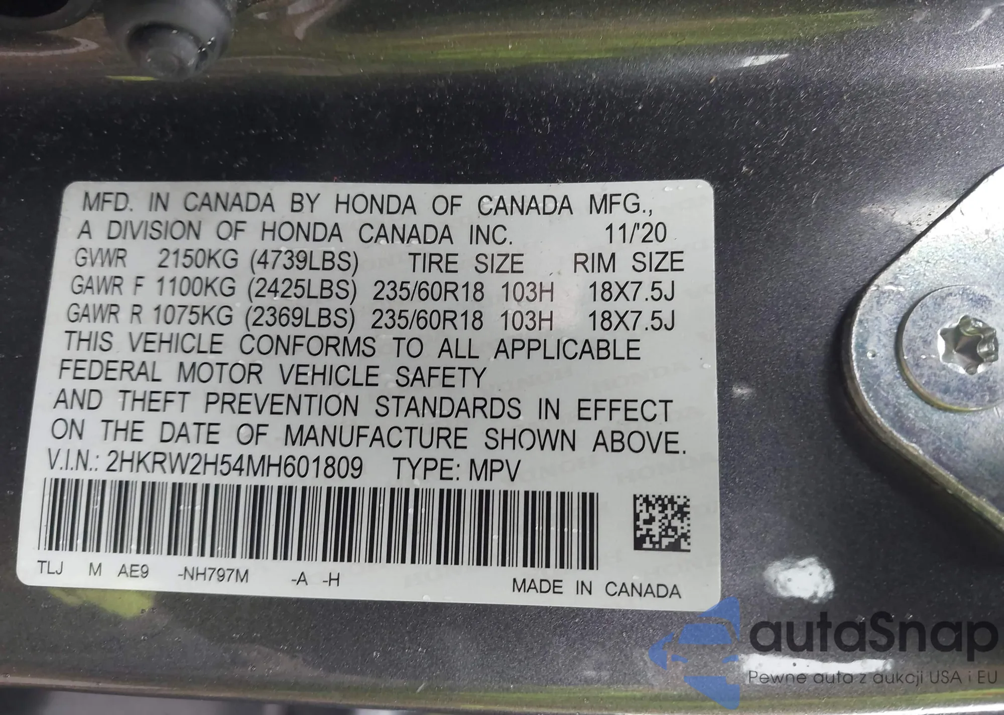 VIN: 2HKRW2H54MH601809