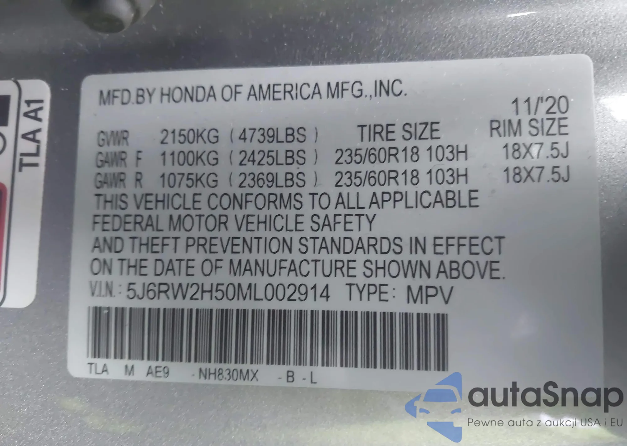 VIN: 5J6RW2H50ML002914
