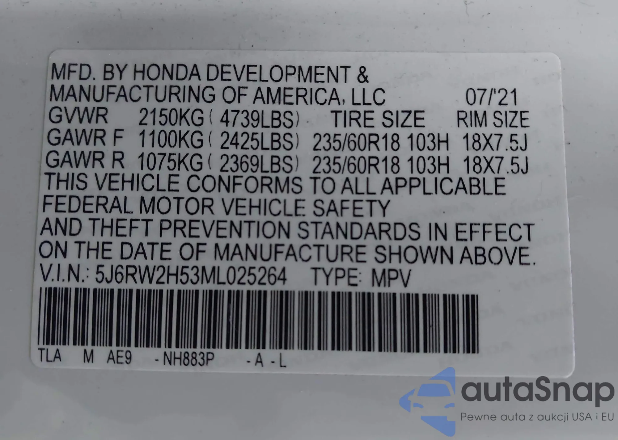 Samochód Honda CR-V 2021 (VIN 5J6RW2H53ML025264) nie był wcześniej licytowany. Dokumenty są czyste, przebieg odpowiada lub jest niższy niż średnia rynku. Sprzedaje go firma ubezpieczeniowa – polecamy zakup. Dostawa do portu zajmie ok. 6–8 tygodni.