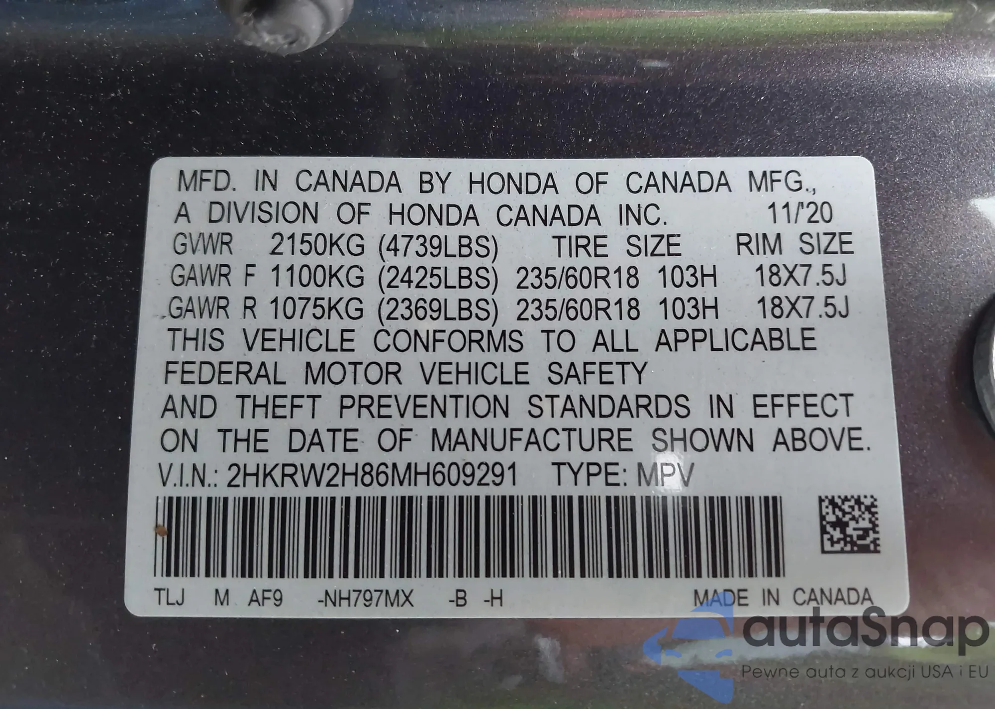 VIN: 2HKRW2H86MH609291