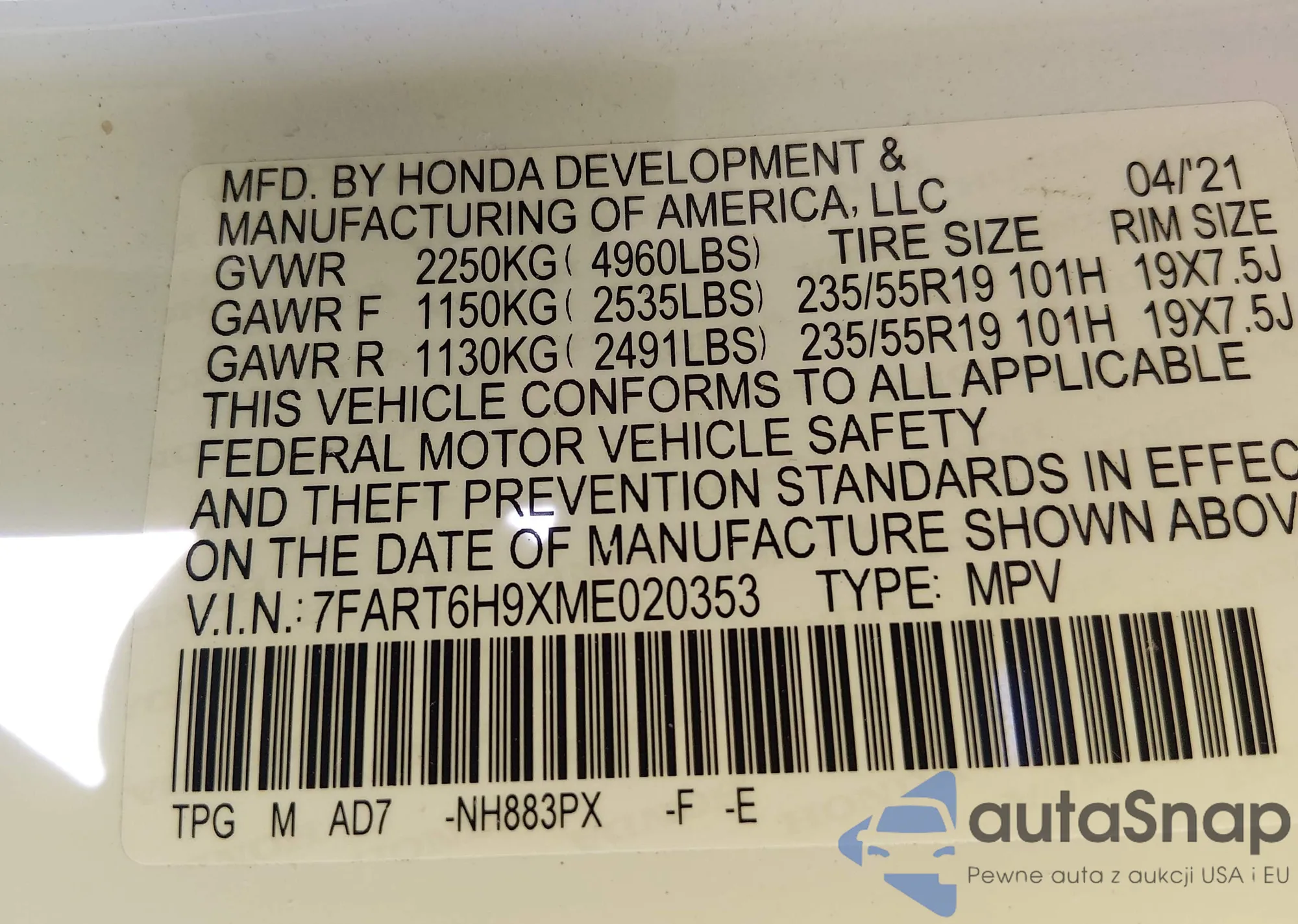 Samochód Honda CR-V 2021 (VIN 7FART6H9XME020353) nie był wcześniej licytowany. Dokumenty są czyste, przebieg odpowiada lub jest niższy niż średnia rynku. Sprzedaje go firma ubezpieczeniowa – polecamy zakup. Dostawa do portu zajmie ok. 6–8 tygodni.