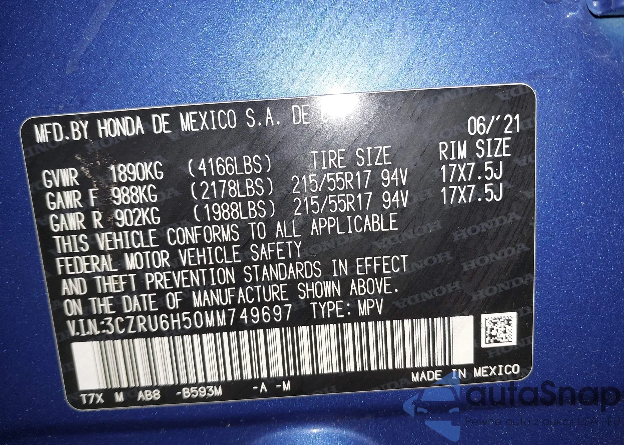 Samochód Honda HR-V 2021 (VIN 3CZRU6H50MM749697) nie był wcześniej licytowany. Dokumenty są czyste, przebieg odpowiada lub jest niższy niż średnia rynku. Sprzedaje go firma ubezpieczeniowa – polecamy zakup. Dostawa do portu zajmie ok. 6–8 tygodni.