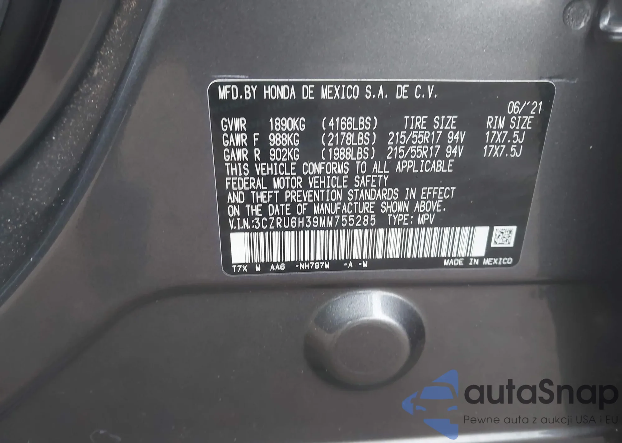 Samochód Honda HR-V 2021 (VIN 3CZRU6H39MM755285) był już licytowany 1 razy i/lub sprzedaje go niezweryfikowany sprzedawca. Zalecamy raport Carfax i potwierdzenie możliwości rejestracji pojazdu przed zakupem.