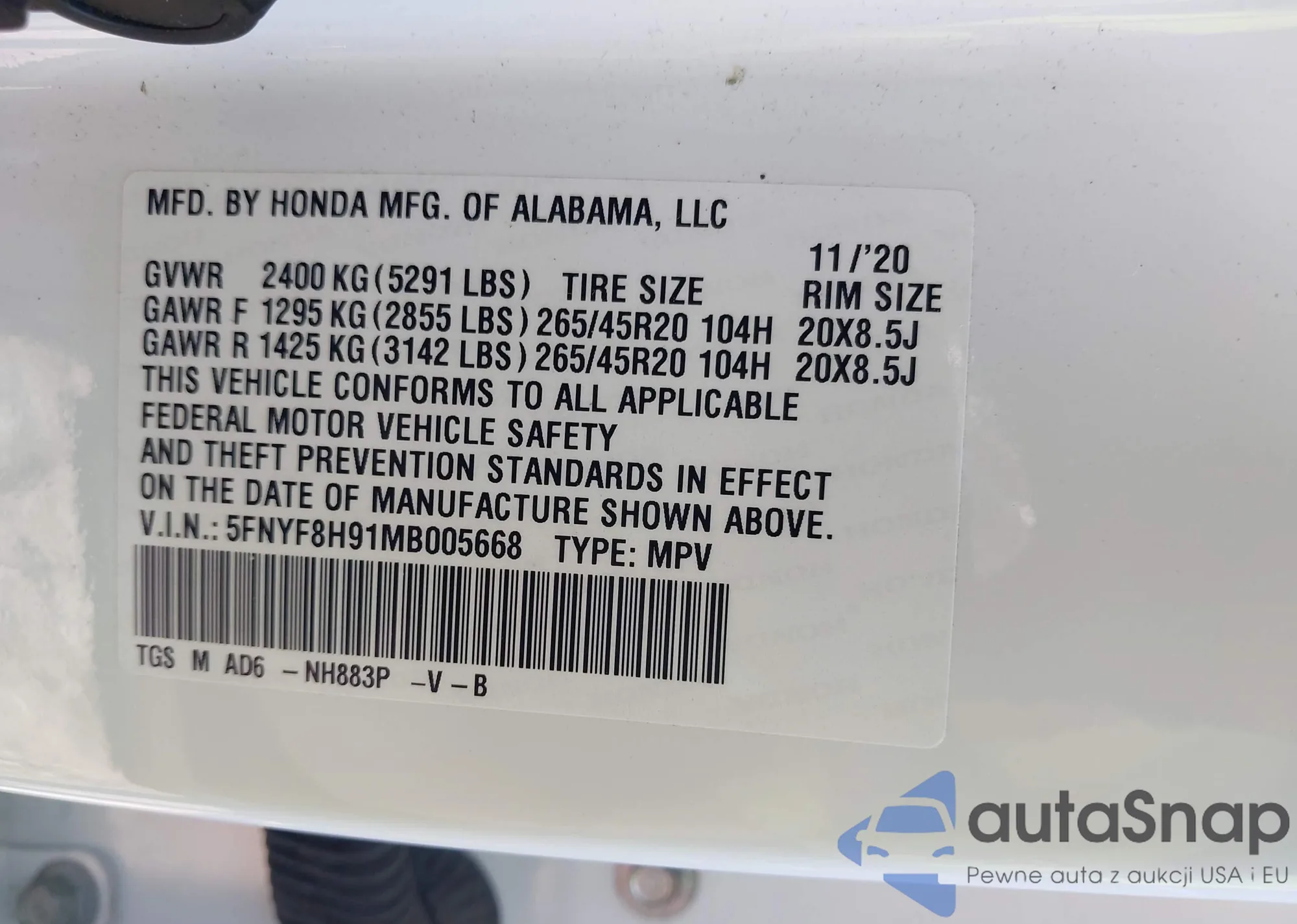 Samochód Honda Passport 2021 (VIN 5FNYF8H91MB005668) nie był wcześniej licytowany. Dokumenty są czyste, przebieg odpowiada lub jest niższy niż średnia rynku. Sprzedaje go firma ubezpieczeniowa – polecamy zakup. Dostawa do portu zajmie ok. 6–8 tygodni.