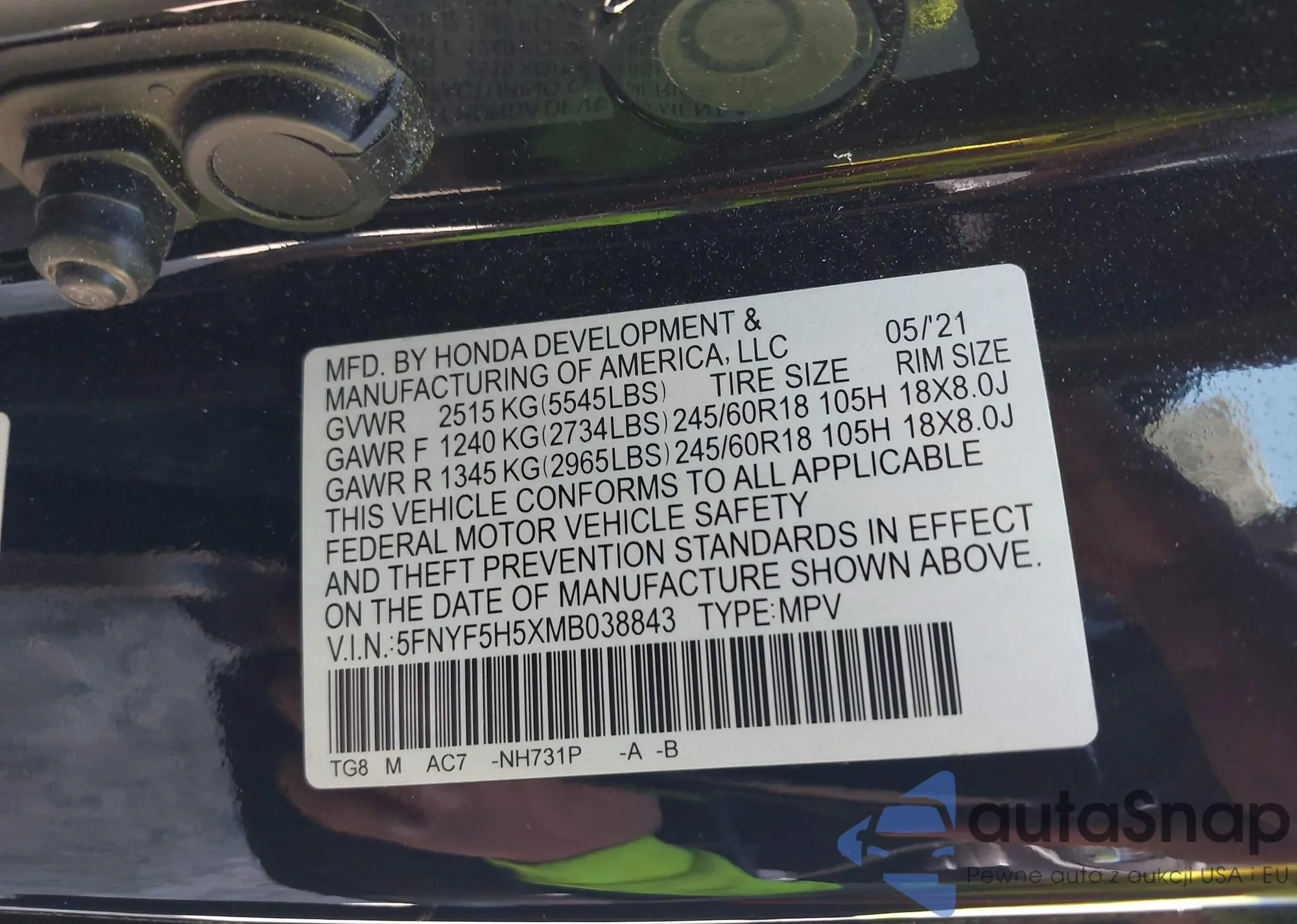 Samochód Honda Pilot 2021 (VIN 5FNYF5H5XMB038843) nie był wcześniej licytowany. Dokumenty są czyste, przebieg odpowiada lub jest niższy niż średnia rynku. Sprzedaje go firma ubezpieczeniowa – polecamy zakup. Dostawa do portu zajmie ok. 6–8 tygodni.