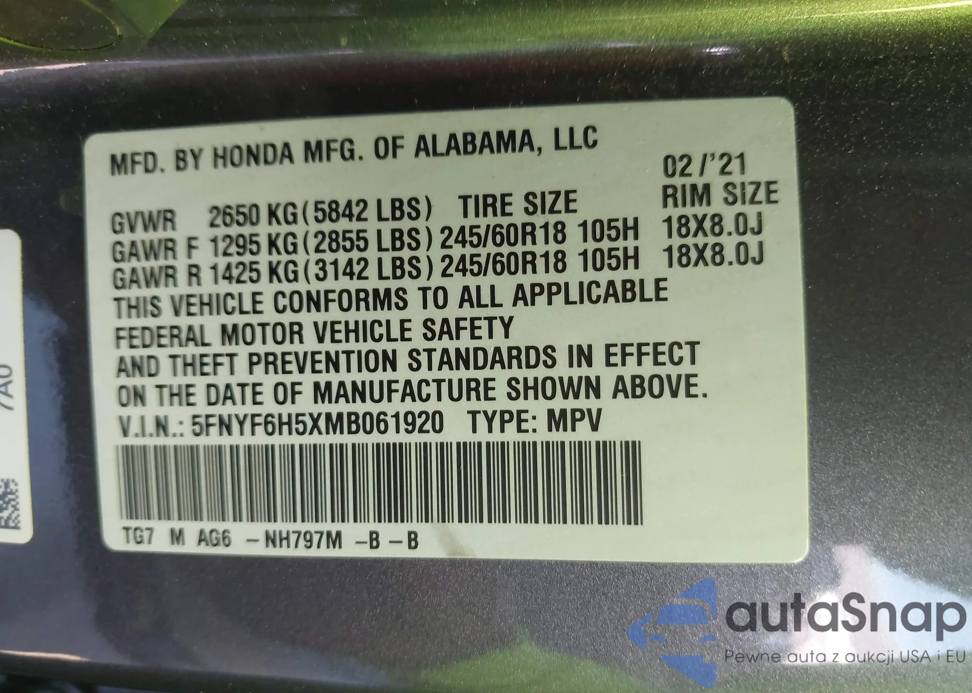 • VIN: 5FNYF6H5XMB061920