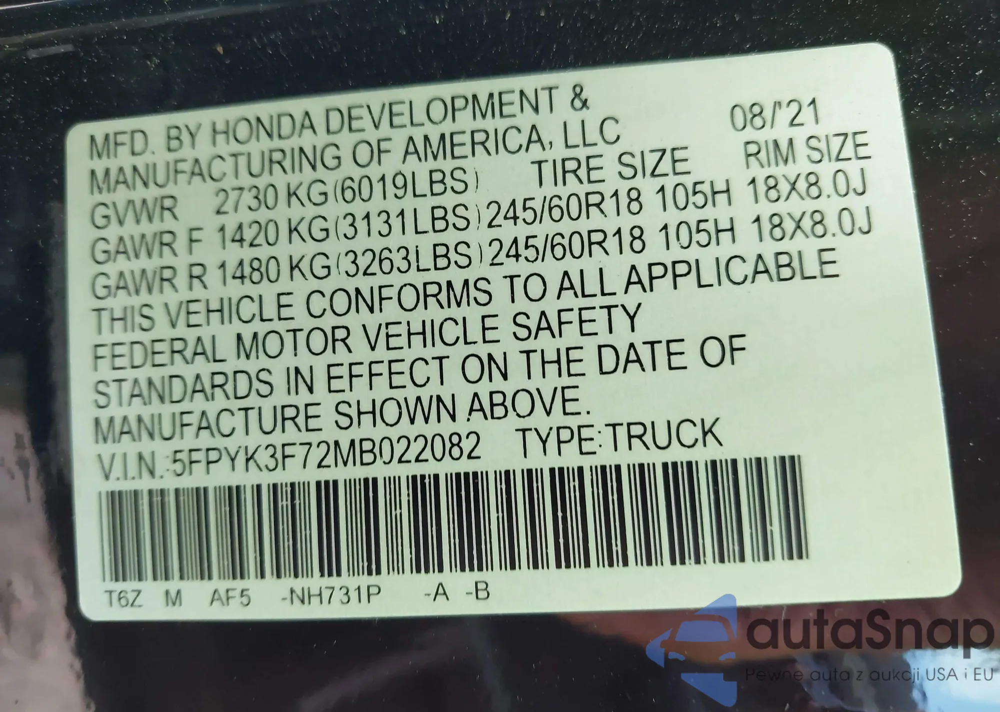 VIN: 5FPYK3F72MB022082