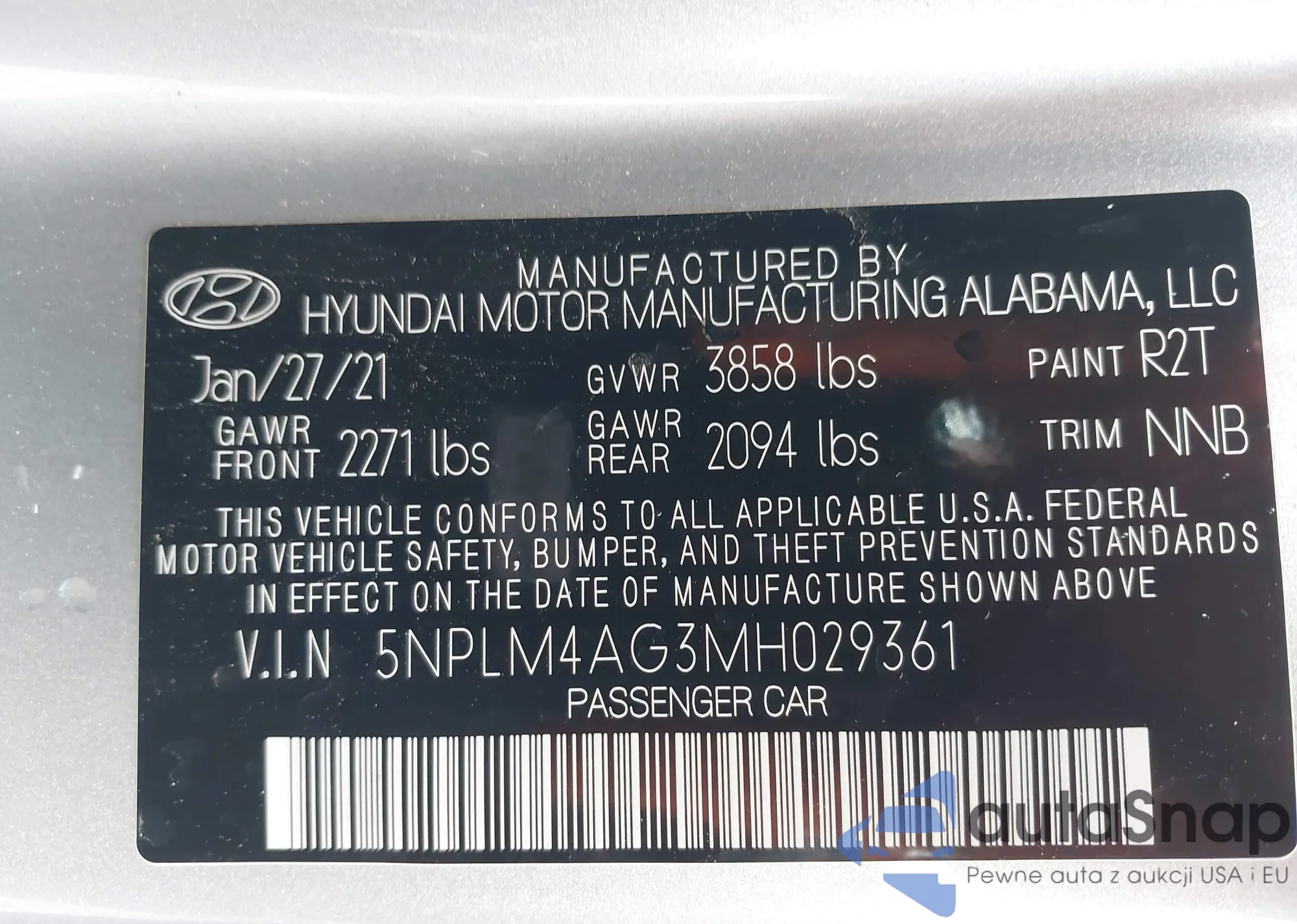 Samochód Hyundai Elantra 2021 (VIN 5NPLM4AG3MH029361) nie był wcześniej licytowany. Dokumenty są czyste, przebieg odpowiada lub jest niższy niż średnia rynku. Sprzedaje go firma ubezpieczeniowa – polecamy zakup. Dostawa do portu zajmie ok. 6–8 tygodni.