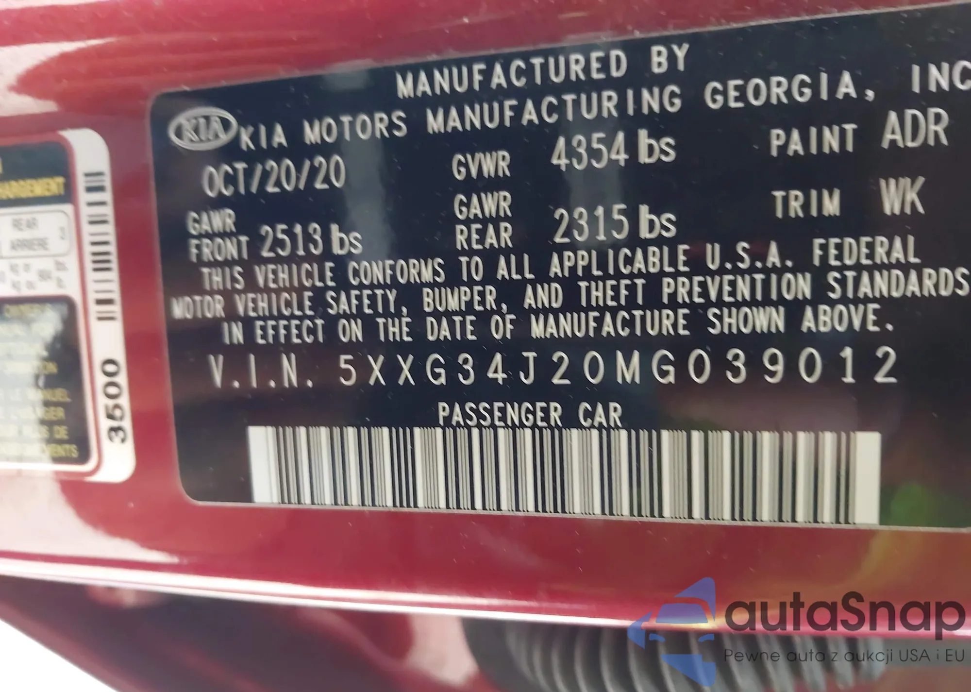 • VIN: 5XXG34J20MG039012