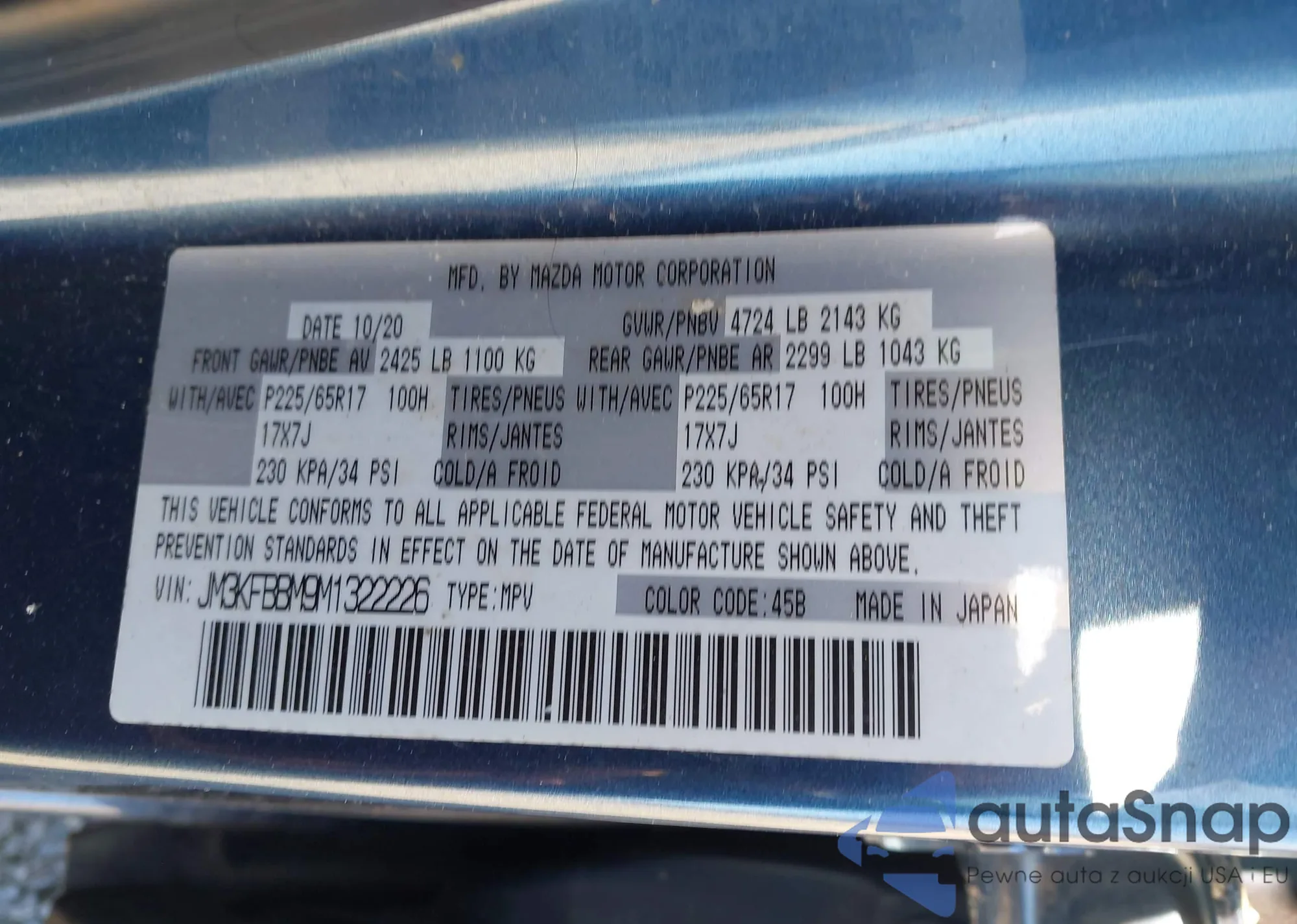 Samochód Mazda CX-5 2021 (VIN JM3KFBBM9M1322226) nie był wcześniej licytowany. Dokumenty są czyste, przebieg odpowiada lub jest niższy niż średnia rynku. Sprzedaje go firma ubezpieczeniowa – polecamy zakup. Dostawa do portu zajmie ok. 6–8 tygodni.