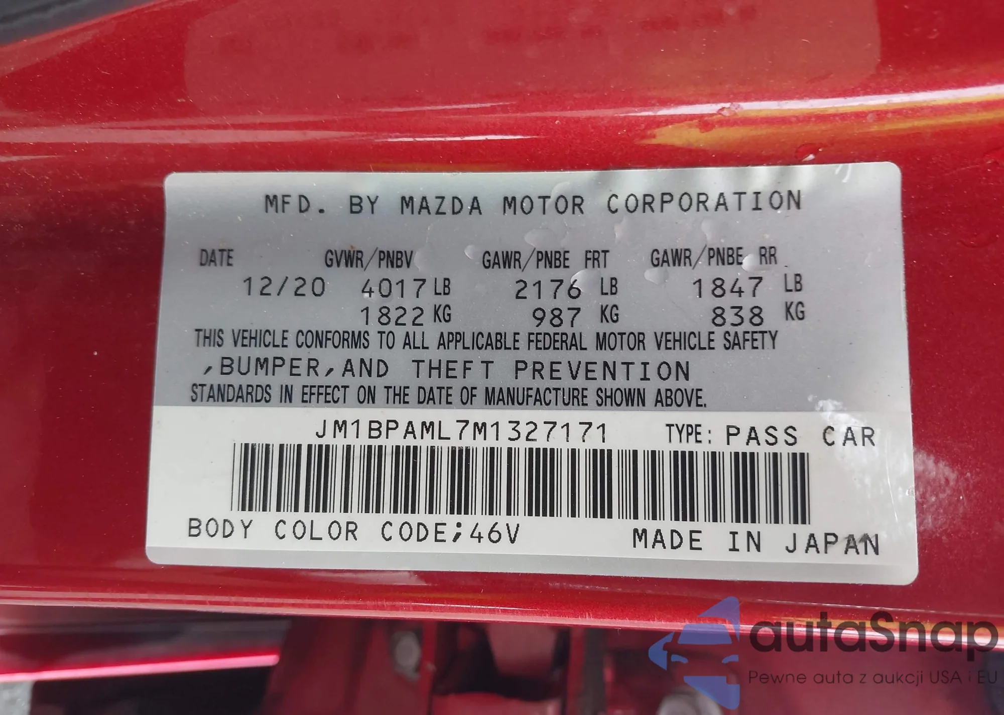Samochód Mazda 3 2021 (VIN JM1BPAML7M1327171) nie był wcześniej licytowany. Dokumenty są czyste, przebieg odpowiada lub jest niższy niż średnia rynku. Sprzedaje go firma ubezpieczeniowa – polecamy zakup. Dostawa do portu zajmie ok. 6–8 tygodni.