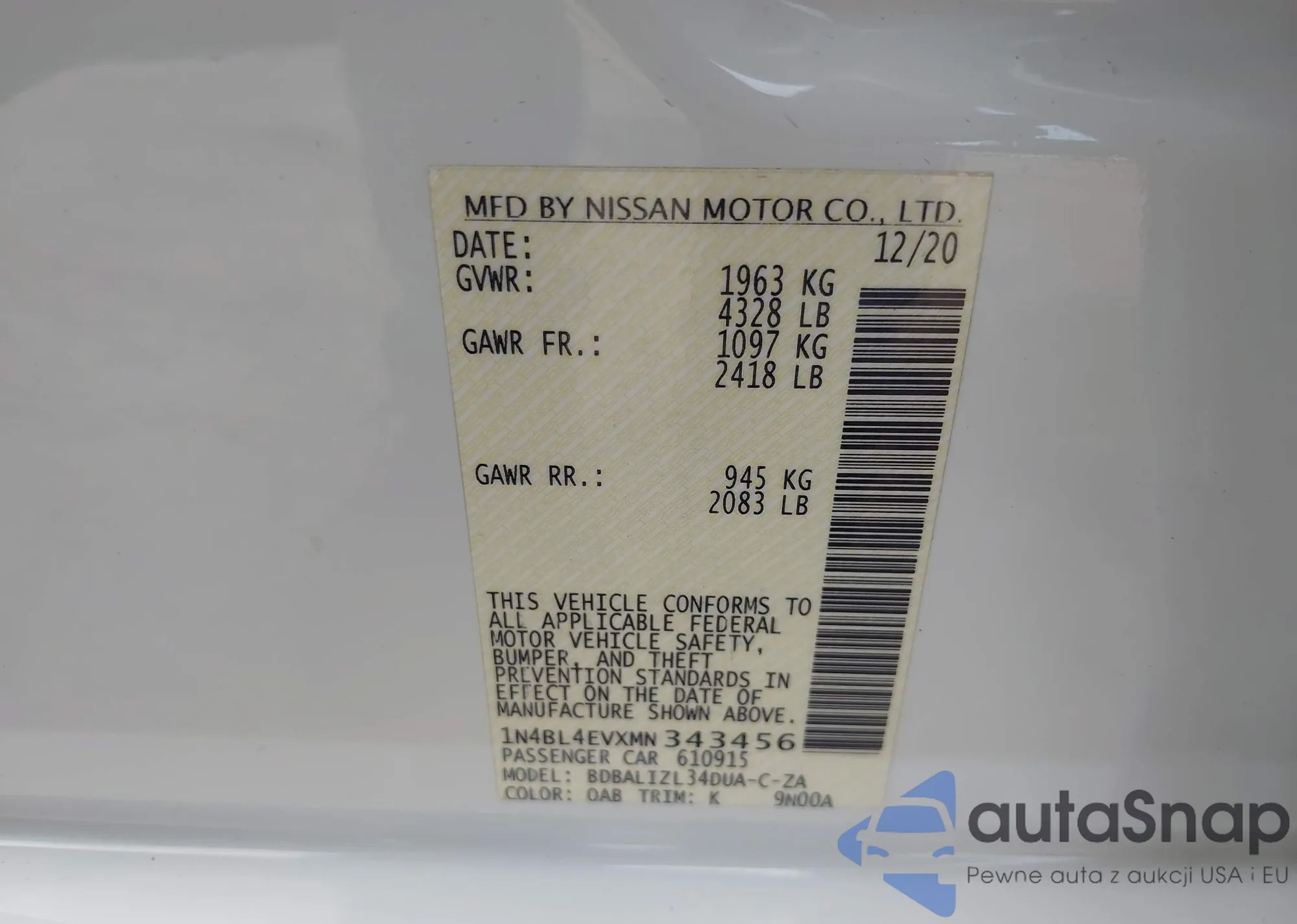 • VIN: 1N4BL4EVXMN343456