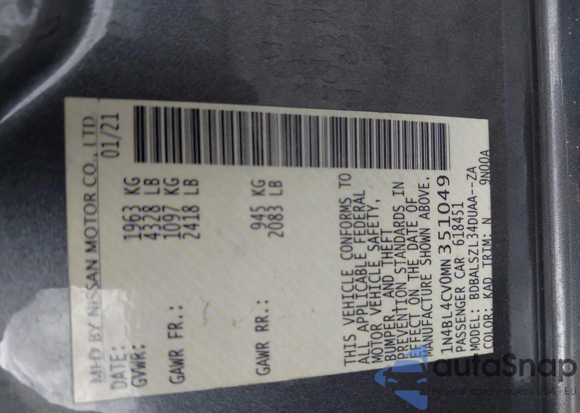 Samochód Nissan Altima 2021 (VIN 1N4BL4CV0MN351049) ma dokumenty uniemożliwiające rejestrację. Mogą pojawić się trudności przy eksporcie i rejestracji. Skontaktuj się z ekspertami AutaSnap w celu znalezienia alternatywy.