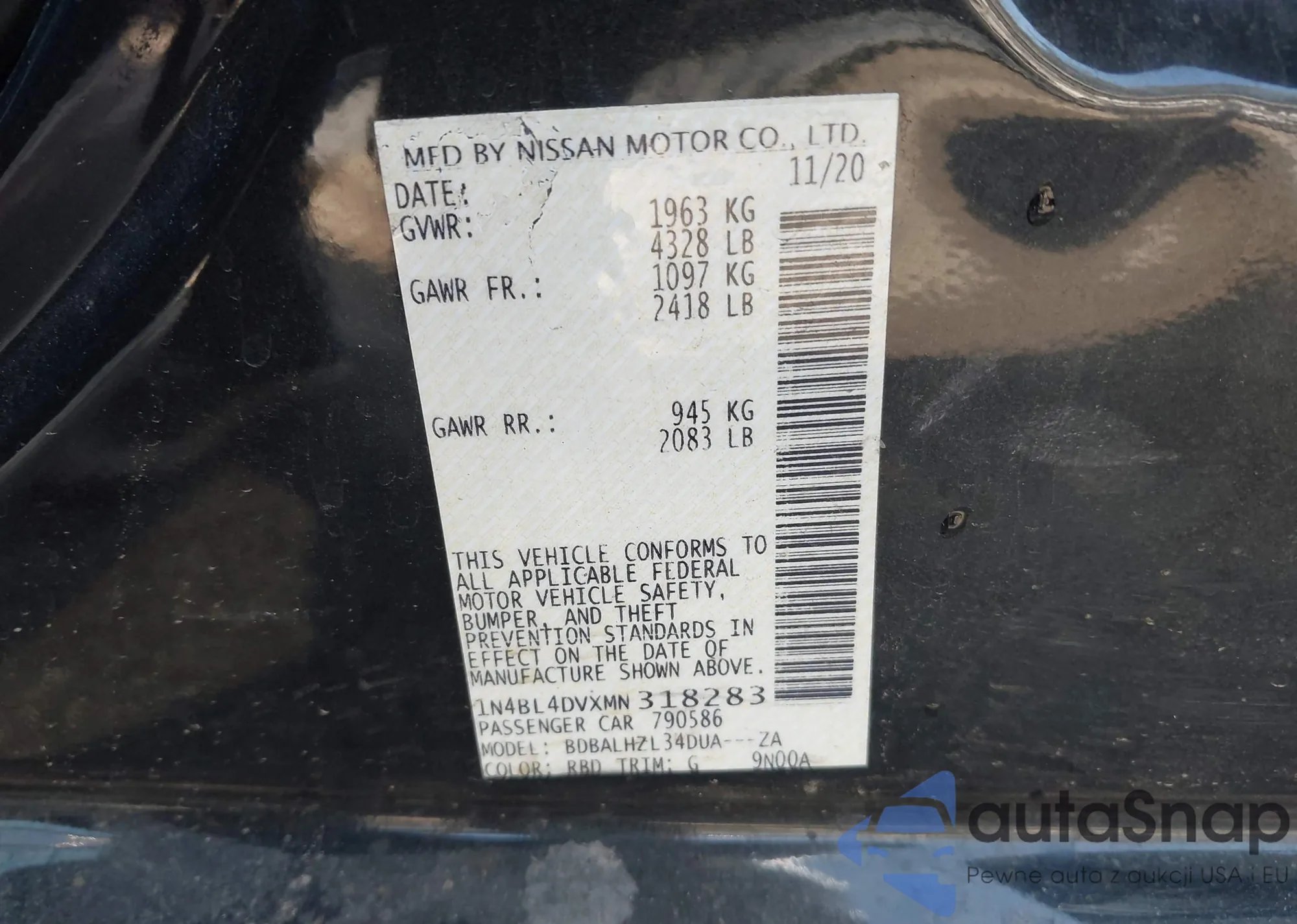 Samochód Nissan Altima 2021 (VIN 1N4BL4DVXMN318283) nie był wcześniej licytowany. Dokumenty są czyste, przebieg odpowiada lub jest niższy niż średnia rynku. Sprzedaje go firma ubezpieczeniowa – polecamy zakup. Dostawa do portu zajmie ok. 6–8 tygodni.