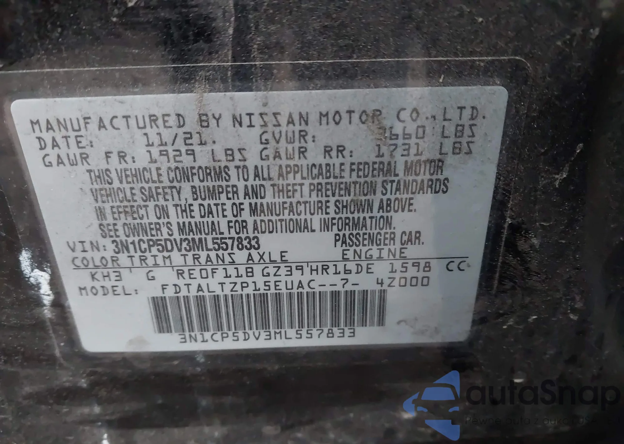 Samochód Nissan Kicks 2021 (VIN 3N1CP5DV3ML557833) ma dokumenty uniemożliwiające rejestrację. Mogą pojawić się trudności przy eksporcie i rejestracji. Skontaktuj się z ekspertami AutaSnap w celu znalezienia alternatywy.