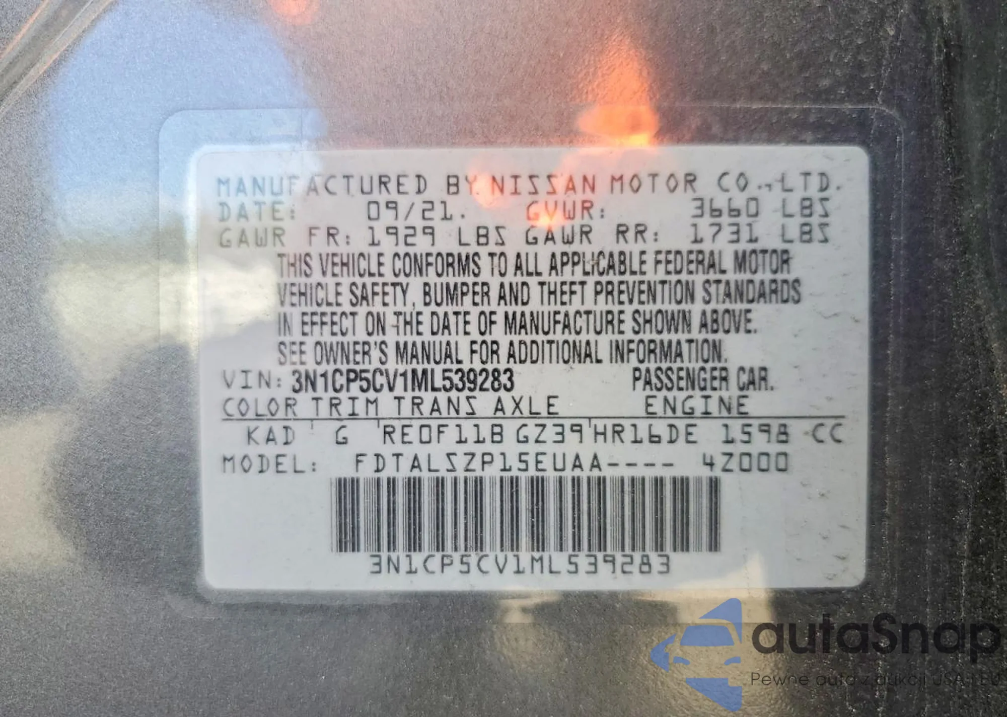 Samochód Nissan Kicks 2021 (VIN 3N1CP5CV1ML539283) nie był wcześniej licytowany. Dokumenty są czyste, przebieg odpowiada lub jest niższy niż średnia rynku. Sprzedaje go firma ubezpieczeniowa – polecamy zakup. Dostawa do portu zajmie ok. 6–8 tygodni.