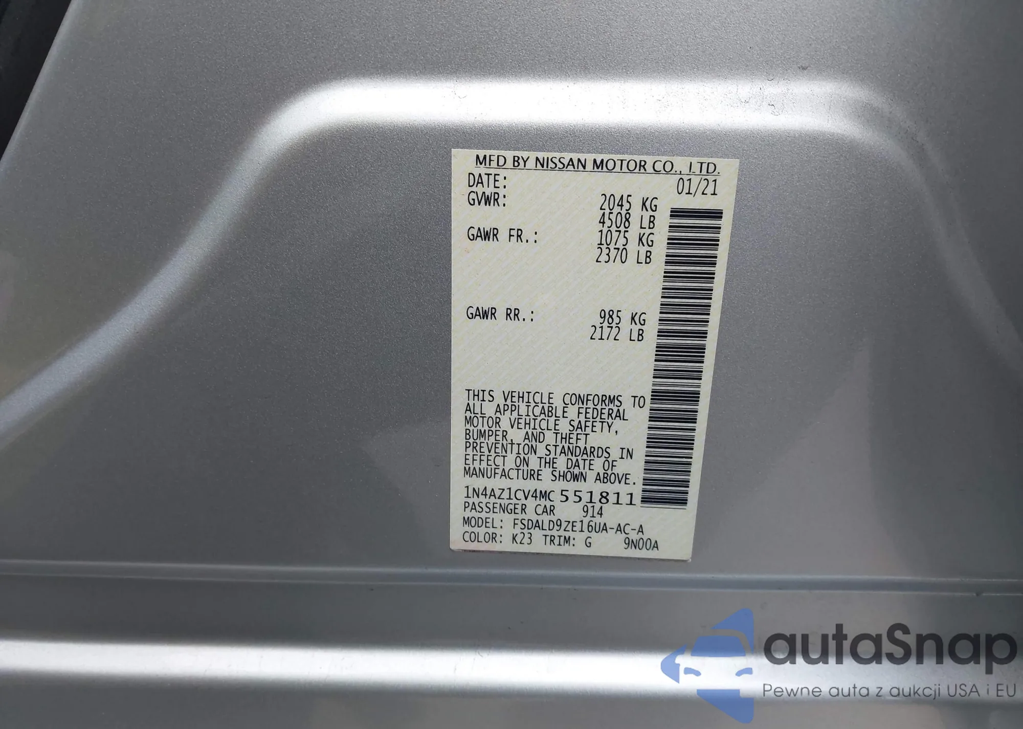 Samochód Nissan Leaf 2021 (VIN 1N4AZ1CV4MC551811) nie był wcześniej licytowany. Dokumenty są czyste, przebieg odpowiada lub jest niższy niż średnia rynku. Sprzedaje go firma ubezpieczeniowa – polecamy zakup. Dostawa do portu zajmie ok. 6–8 tygodni.