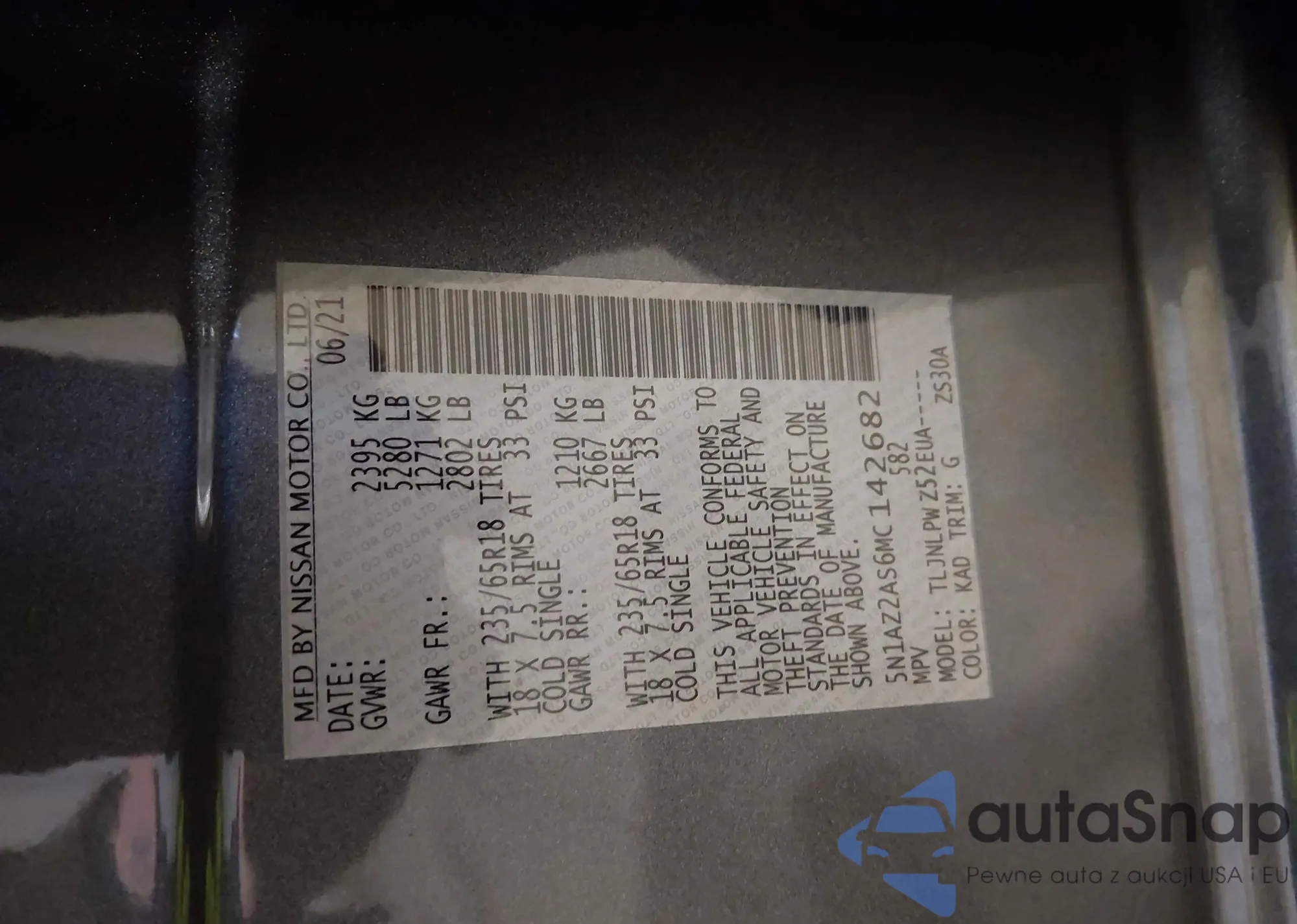Samochód Nissan Murano 2021 (VIN 5N1AZ2AS6MC142682) nie był wcześniej licytowany. Dokumenty są czyste, przebieg odpowiada lub jest niższy niż średnia rynku. Sprzedaje go firma ubezpieczeniowa – polecamy zakup. Dostawa do portu zajmie ok. 6–8 tygodni.