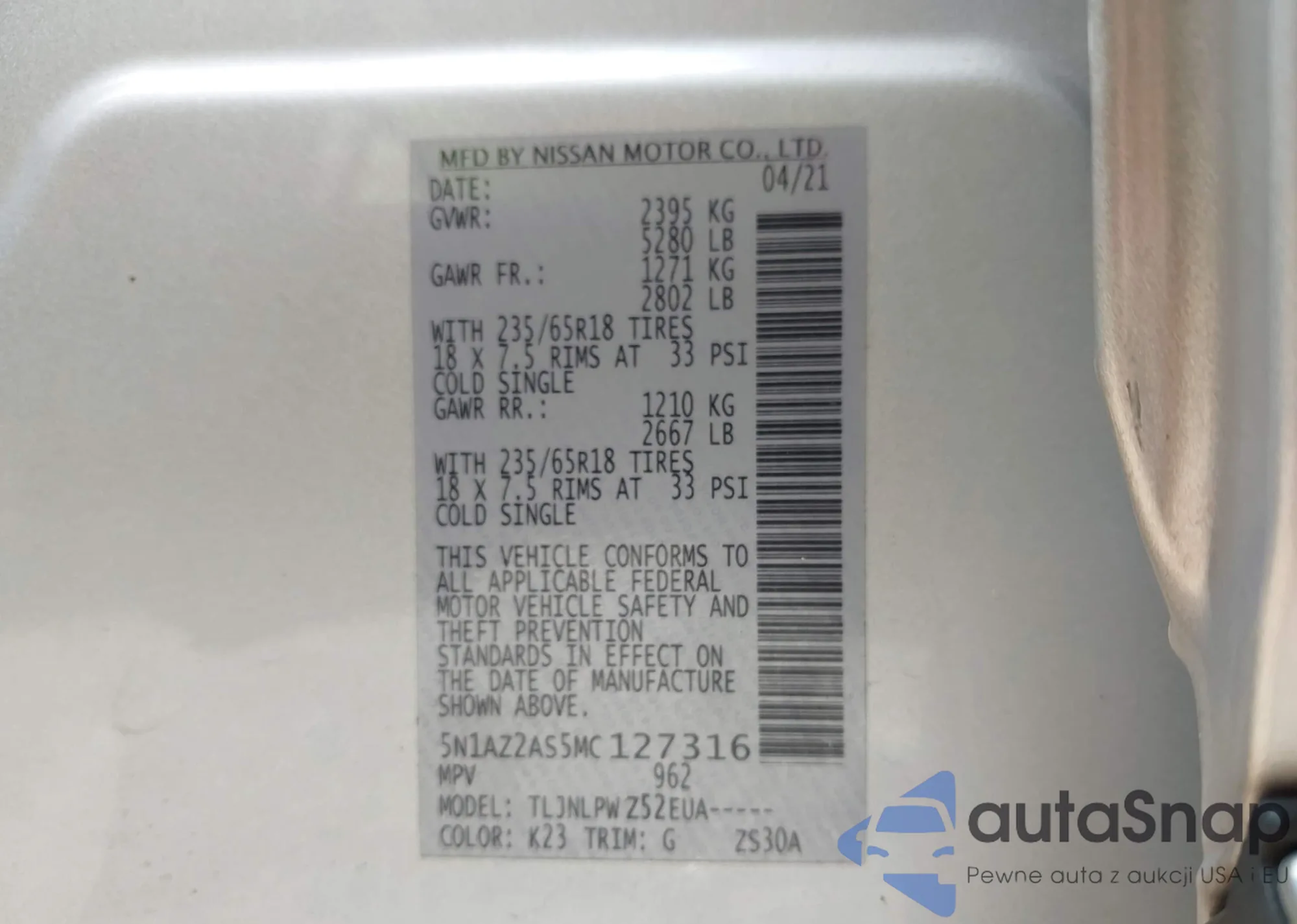 VIN: 5N1AZ2AS5MC127316