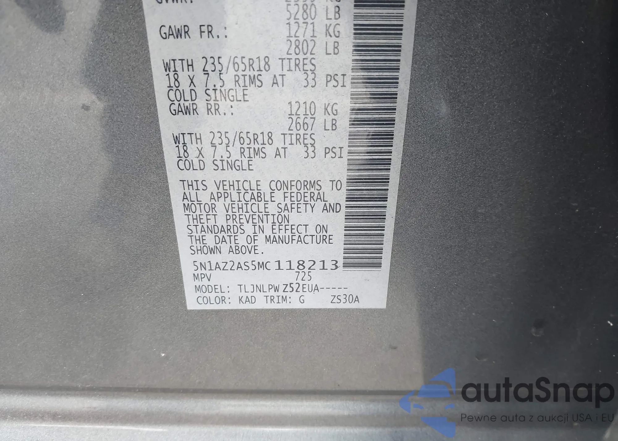 • VIN: 5N1AZ2AS5MC118213