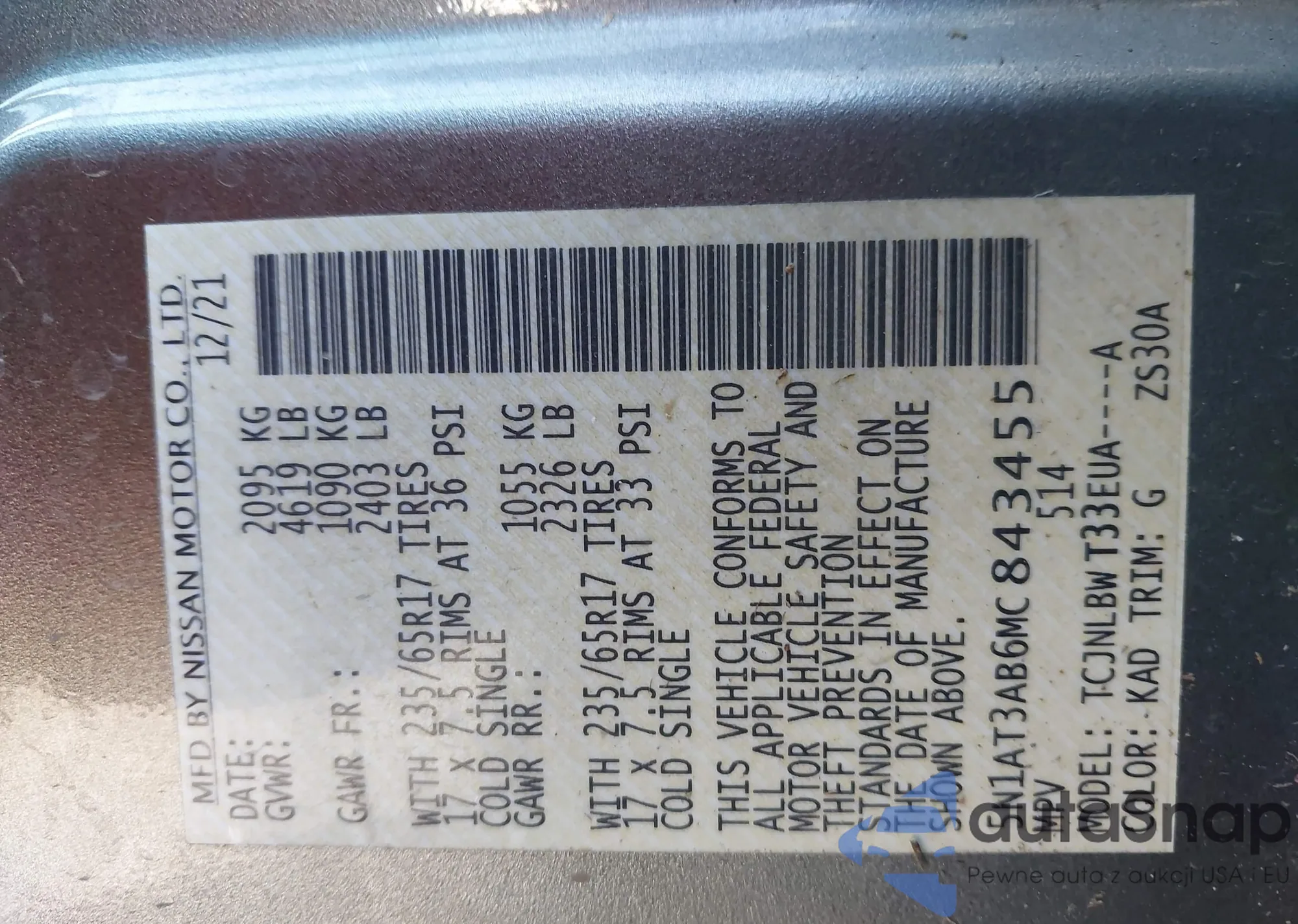 Samochód Nissan Rogue 2021 (VIN 5N1AT3AB6MC843455) nie był wcześniej licytowany. Dokumenty są czyste, przebieg odpowiada lub jest niższy niż średnia rynku. Sprzedaje go firma ubezpieczeniowa – polecamy zakup. Dostawa do portu zajmie ok. 6–8 tygodni.