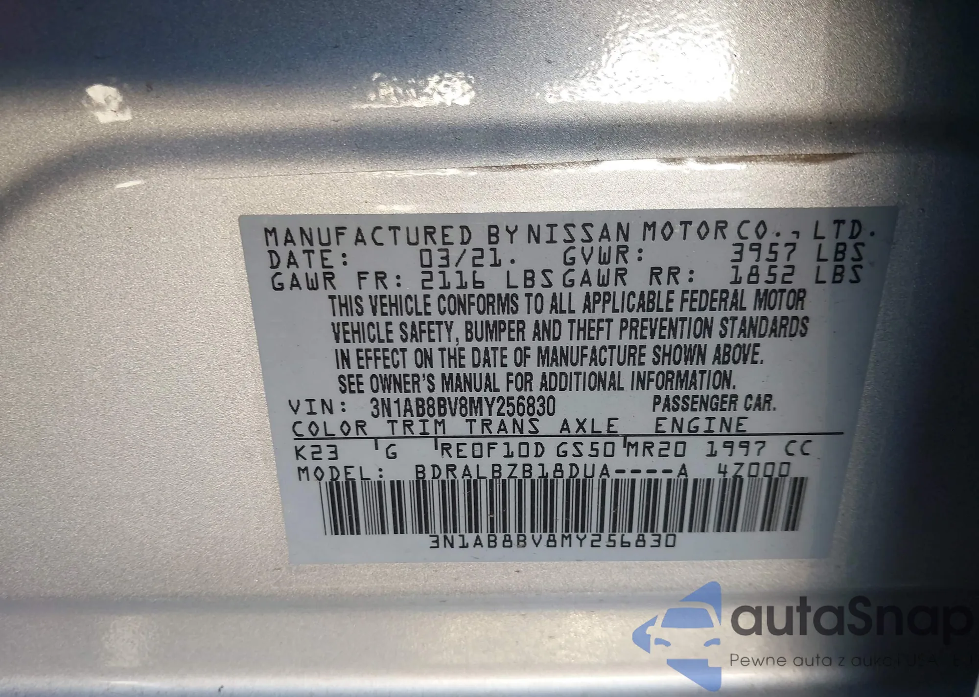 VIN: 3N1AB8BV8MY256830