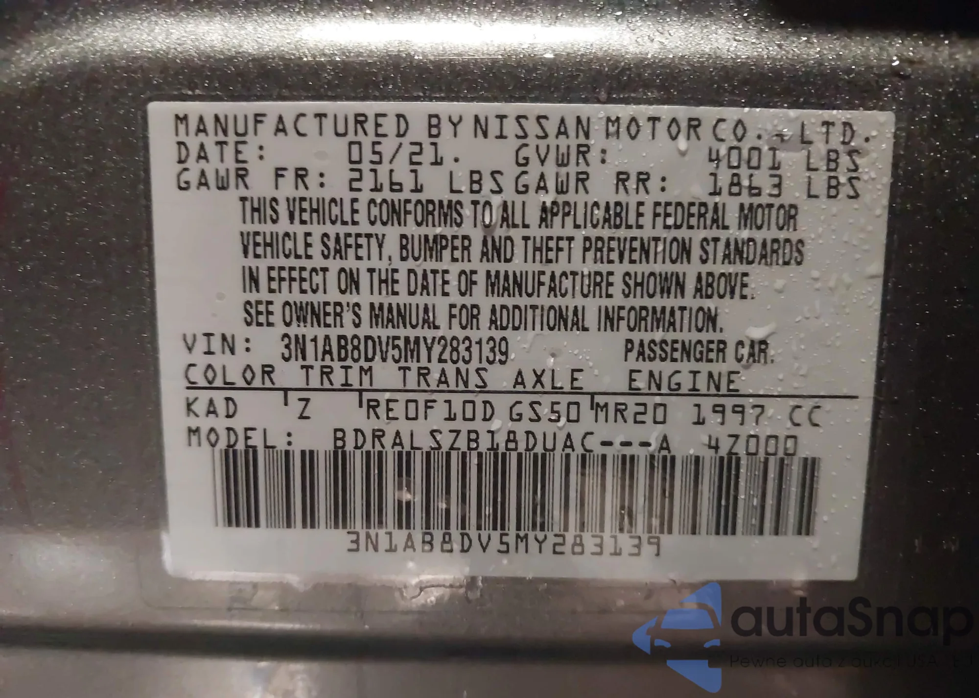 VIN: 3N1AB8DV5MY283139