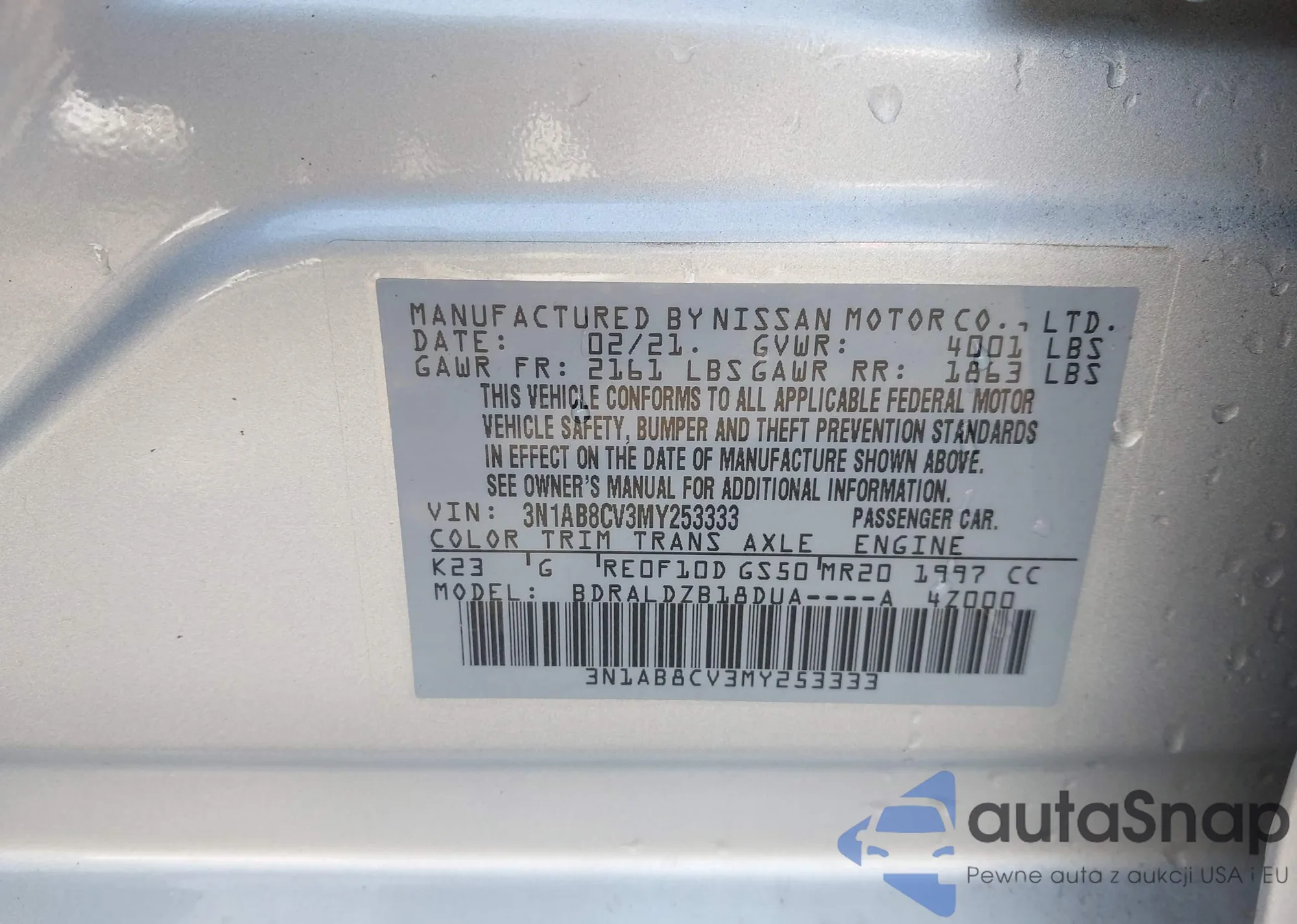 Samochód Nissan Sentra 2021 (VIN 3N1AB8CV3MY253333) nie był wcześniej licytowany. Dokumenty są czyste, przebieg odpowiada lub jest niższy niż średnia rynku. Sprzedaje go firma ubezpieczeniowa – polecamy zakup. Dostawa do portu zajmie ok. 6–8 tygodni.