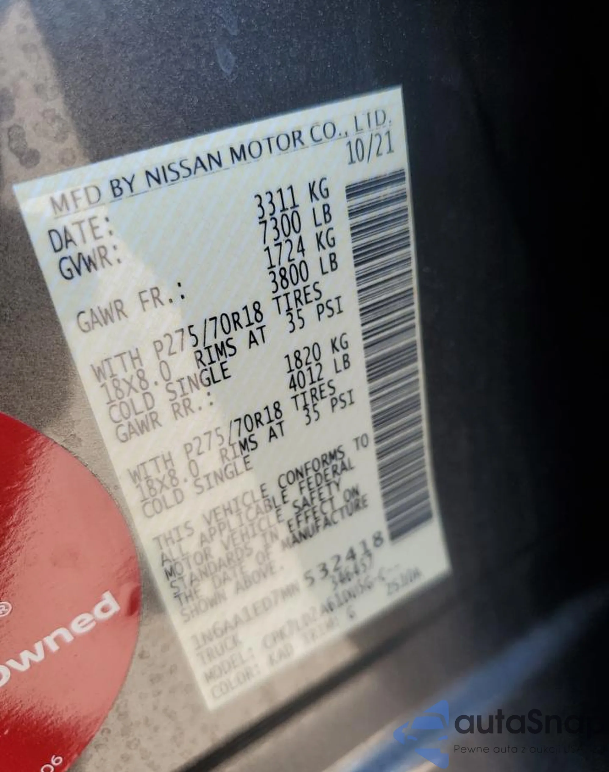 Samochód Nissan Titan 2021 (VIN 1N6AA1ED7MN532418) nie był wcześniej licytowany. Dokumenty są czyste, przebieg odpowiada lub jest niższy niż średnia rynku. Sprzedaje go firma ubezpieczeniowa – polecamy zakup. Dostawa do portu zajmie ok. 6–8 tygodni.