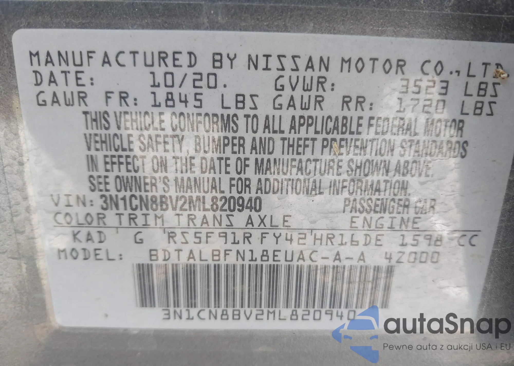 VIN: 3N1CN8BV2ML820940