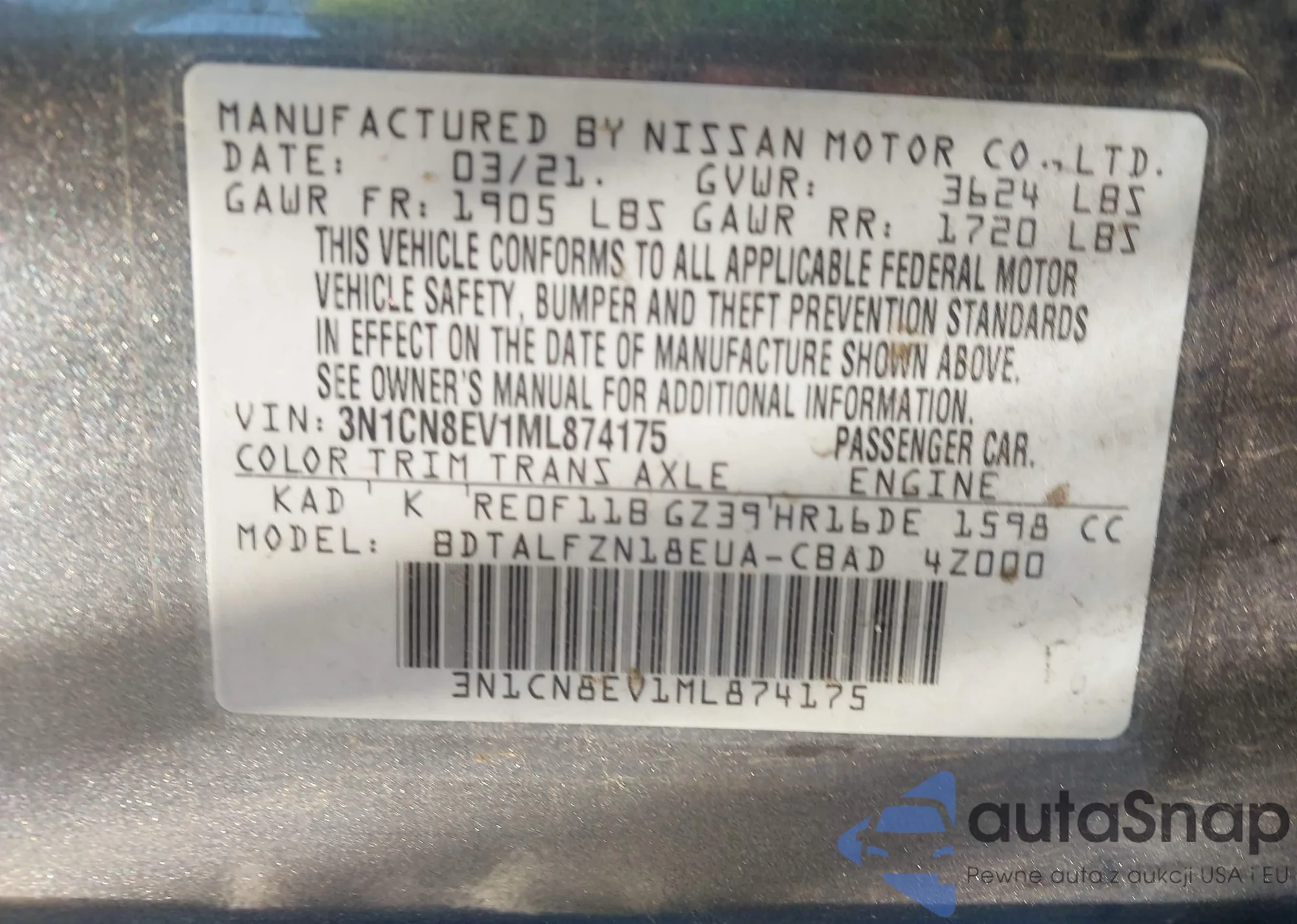 Samochód Nissan Versa 2021 (VIN 3N1CN8EV1ML874175) nie był wcześniej licytowany. Dokumenty są czyste, przebieg odpowiada lub jest niższy niż średnia rynku. Sprzedaje go firma ubezpieczeniowa – polecamy zakup. Dostawa do portu zajmie ok. 6–8 tygodni.