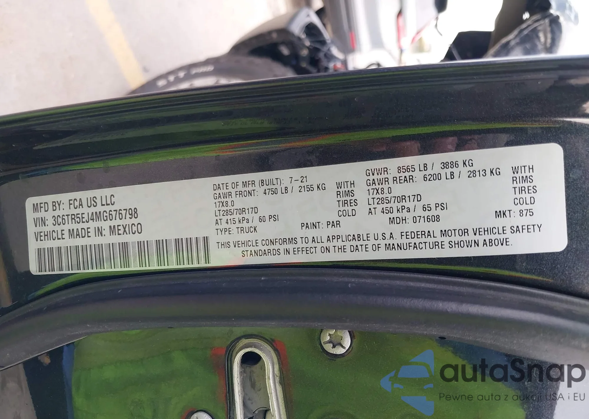 Samochód RAM 2500 2021 (VIN 3C6TR5EJ4MG676798) nie był wcześniej licytowany. Dokumenty są czyste, przebieg odpowiada lub jest niższy niż średnia rynku. Sprzedaje go firma ubezpieczeniowa – polecamy zakup. Dostawa do portu zajmie ok. 6–8 tygodni.