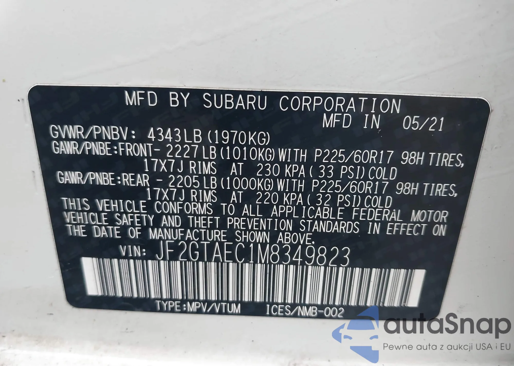 Samochód Subaru XV 2021 (VIN JF2GTAEC1M8349823) ma dokumenty uniemożliwiające rejestrację. Mogą pojawić się trudności przy eksporcie i rejestracji. Skontaktuj się z ekspertami AutaSnap w celu znalezienia alternatywy.