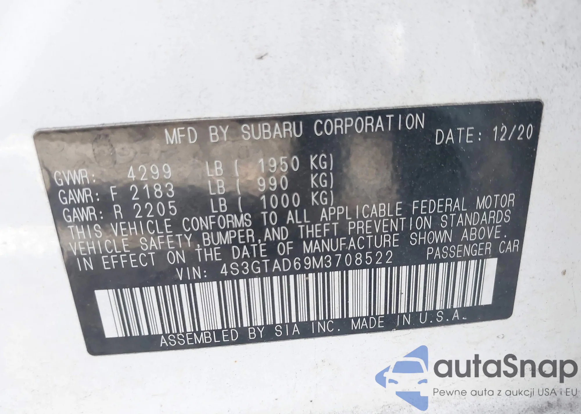Samochód Subaru Impreza 2021 (VIN 4S3GTAD69M3708522) nie był wcześniej licytowany. Dokumenty są czyste, przebieg odpowiada lub jest niższy niż średnia rynku. Sprzedaje go firma ubezpieczeniowa – polecamy zakup. Dostawa do portu zajmie ok. 6–8 tygodni.