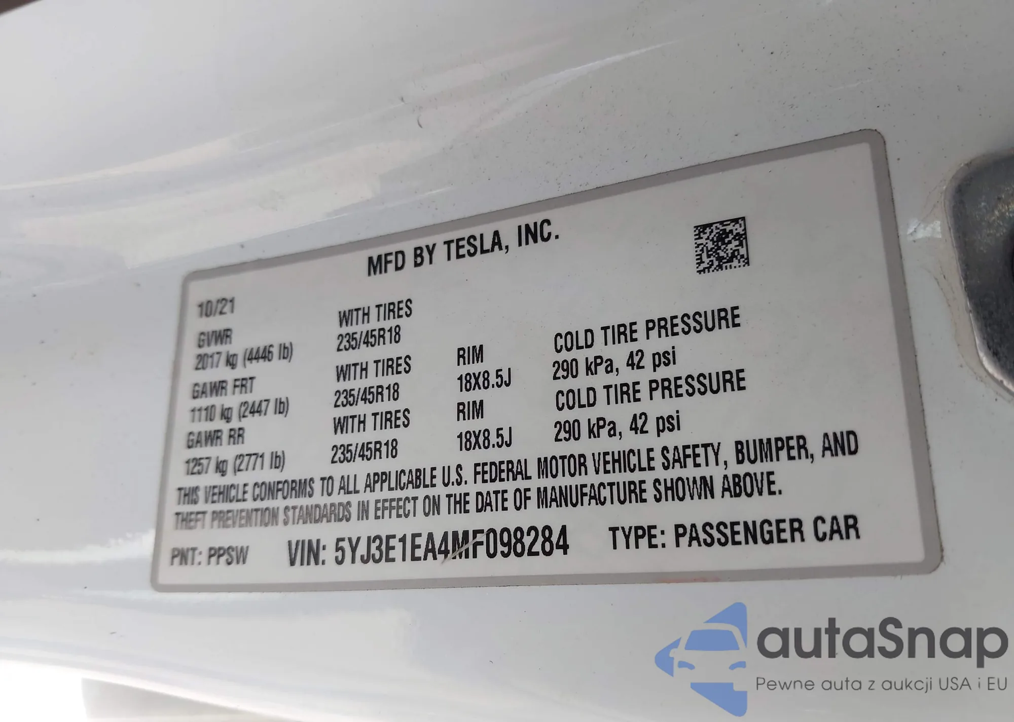 VIN: 5YJ3E1EA4MF098284