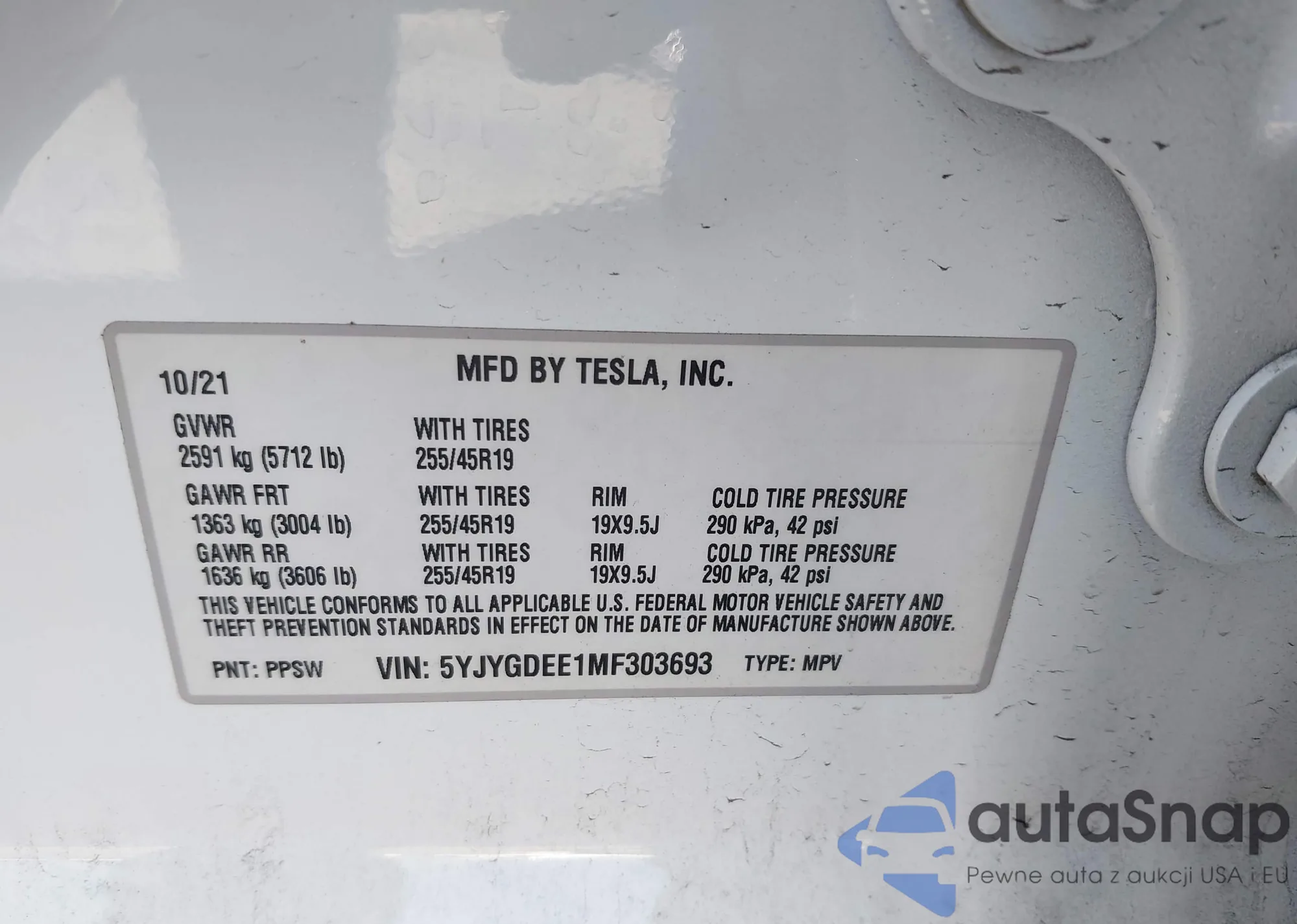 Samochód Tesla Model Y 2021 (VIN 5YJYGDEE1MF303693) nie był wcześniej licytowany. Dokumenty są czyste, przebieg odpowiada lub jest niższy niż średnia rynku. Sprzedaje go firma ubezpieczeniowa – polecamy zakup. Dostawa do portu zajmie ok. 6–8 tygodni.