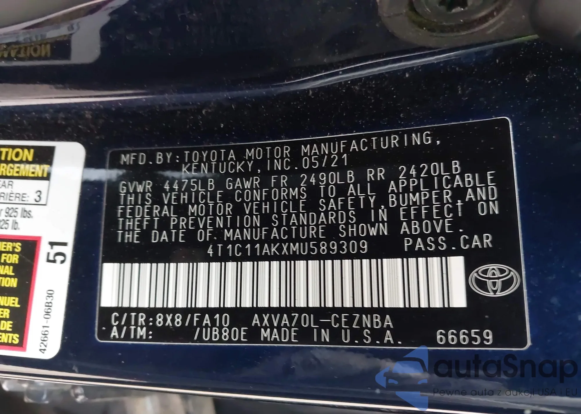 Samochód Toyota Camry 2021 (VIN 4T1C11AKXMU589309) nie był wcześniej licytowany. Dokumenty są czyste, przebieg odpowiada lub jest niższy niż średnia rynku. Sprzedaje go firma ubezpieczeniowa – polecamy zakup. Dostawa do portu zajmie ok. 6–8 tygodni.