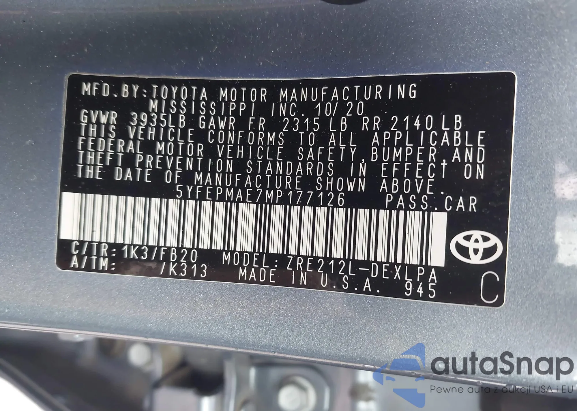 Samochód Toyota Corolla 2021 (VIN 5YFEPMAE7MP177126) nie był wcześniej licytowany. Dokumenty są czyste, przebieg odpowiada lub jest niższy niż średnia rynku. Sprzedaje go firma ubezpieczeniowa – polecamy zakup. Dostawa do portu zajmie ok. 6–8 tygodni.