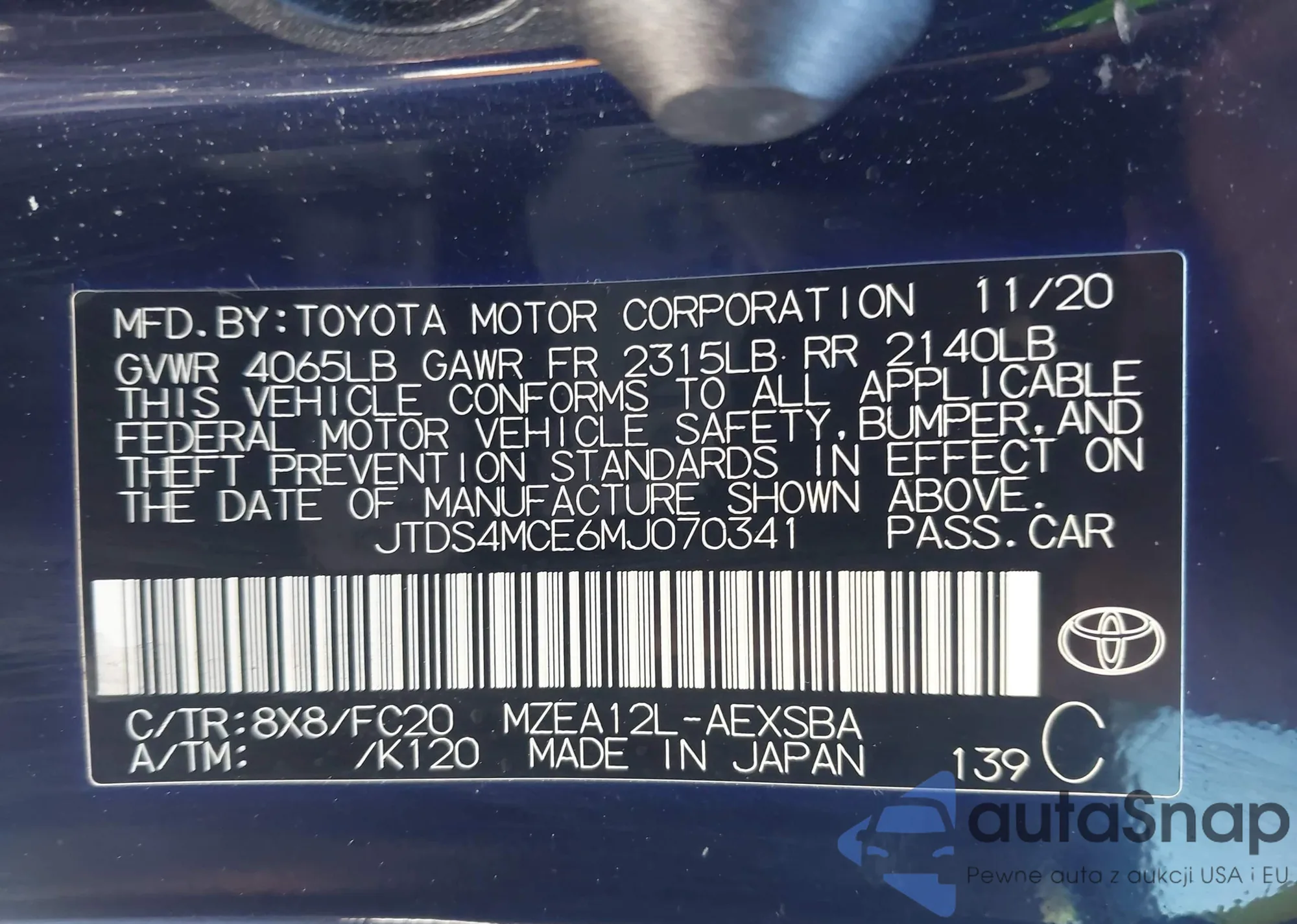 Samochód Toyota Corolla 2021 (VIN JTDS4MCE6MJ070341) nie był wcześniej licytowany. Dokumenty są czyste, przebieg odpowiada lub jest niższy niż średnia rynku. Sprzedaje go firma ubezpieczeniowa – polecamy zakup. Dostawa do portu zajmie ok. 6–8 tygodni.