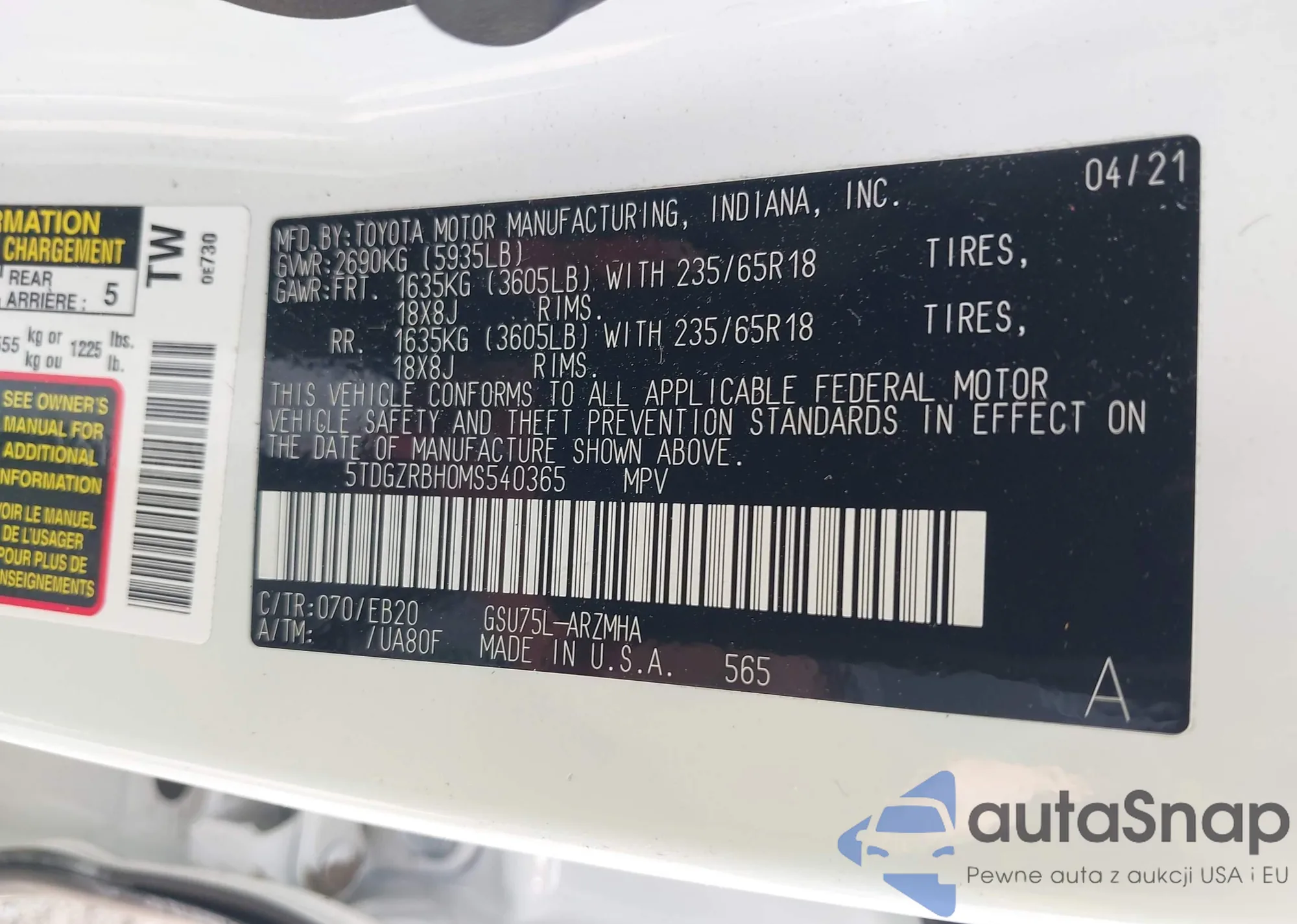VIN: 5TDGZRBH0MS540365