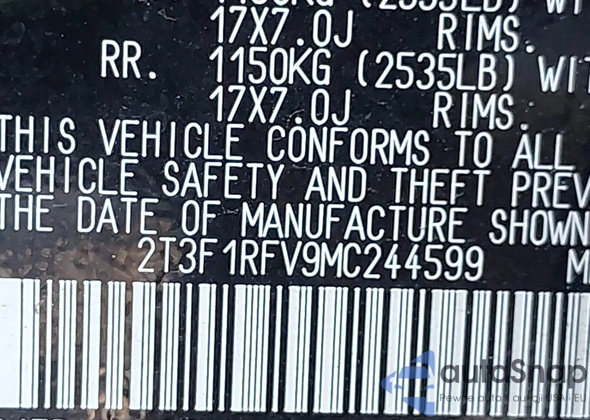 Samochód Toyota RAV 4 2021 (VIN 2T3F1RFV9MC244599) nie był wcześniej licytowany. Dokumenty są czyste, przebieg odpowiada lub jest niższy niż średnia rynku. Sprzedaje go firma ubezpieczeniowa – polecamy zakup. Dostawa do portu zajmie ok. 6–8 tygodni.