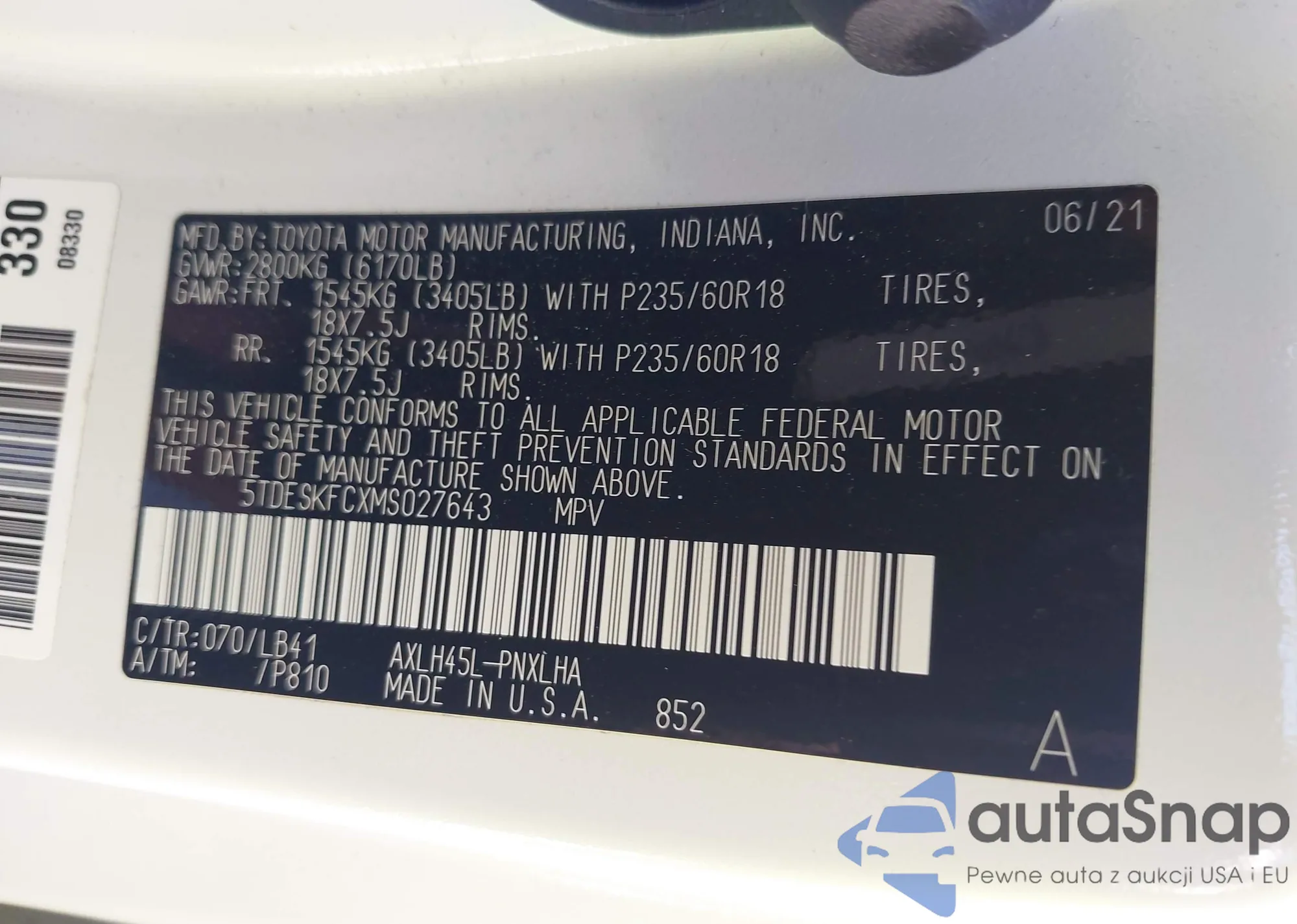 Samochód Toyota Sienna 2021 (VIN 5TDESKFCXMS027643) ma dokumenty uniemożliwiające rejestrację. Mogą pojawić się trudności przy eksporcie i rejestracji. Skontaktuj się z ekspertami AutaSnap w celu znalezienia alternatywy.