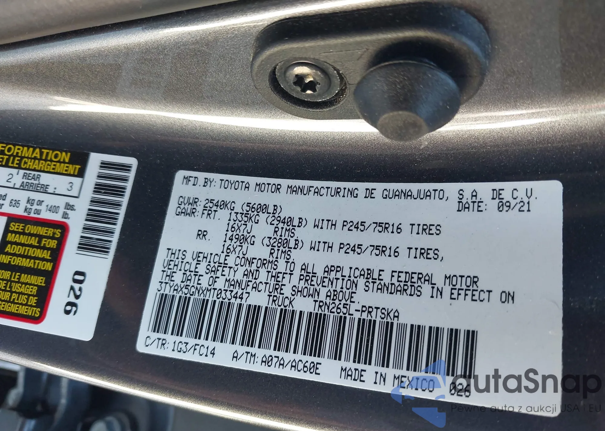 • VIN: 3TYAX5GNXMT033447