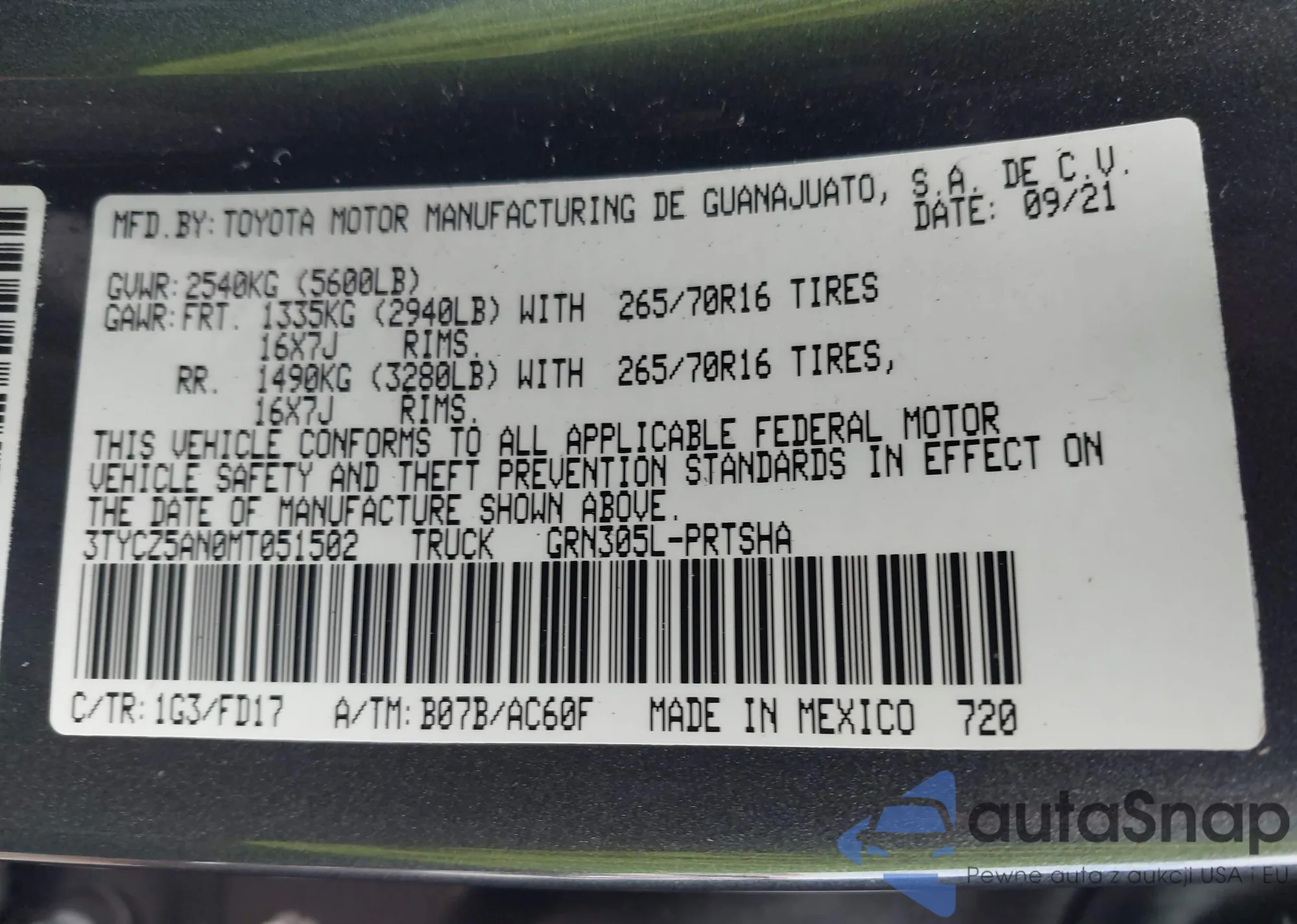 VIN: 3TYCZ5AN0MT051502
